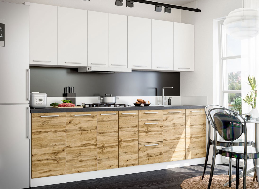 Фасади кухні “Родос” виготовлені з ДСП товщиною 18 мм та доповнюються стильною ручкою, що в сумі формує доступний варіант за ціною. Завдяки горизонтальній спрямованості ліній ручки та текстури дерева, фасади «Родос», навіть у невеликій кухні, візуально розширюють простір, надають відчуття рівноваги та стилю.