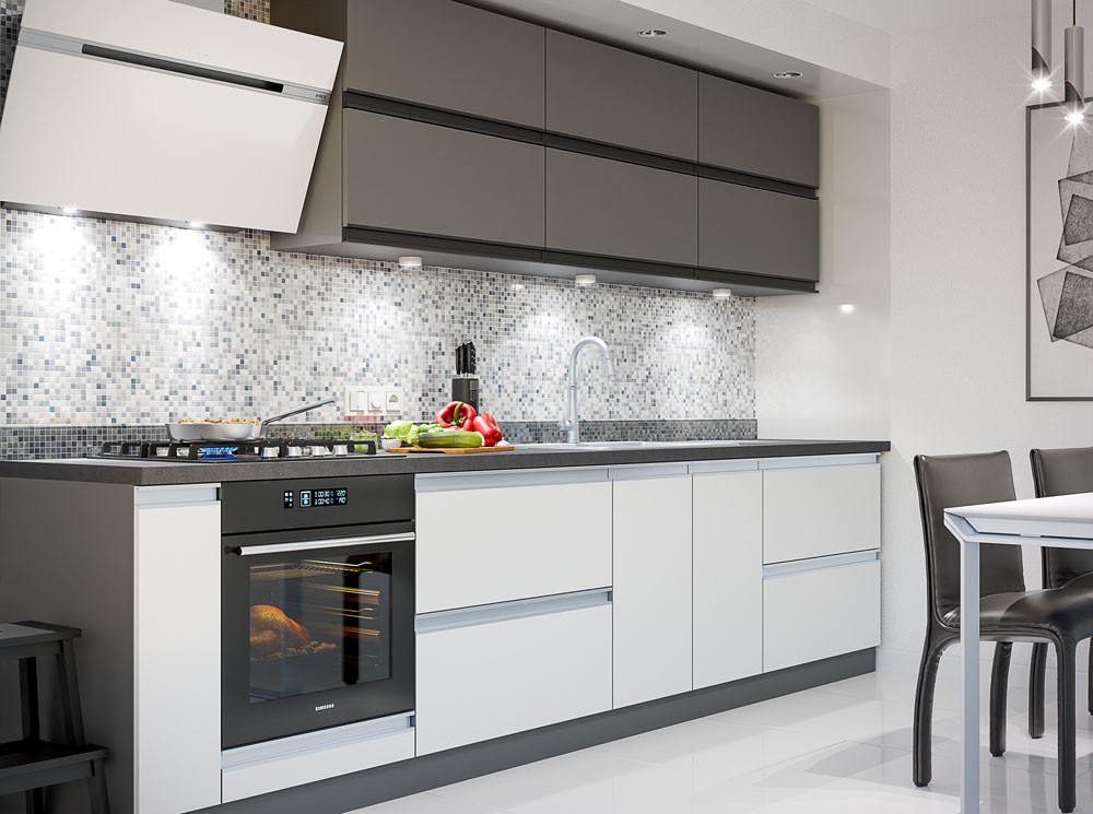 Кухня «GaMa» — лаконічний фасад простих форм і ліній, виконаний з плити ДСП завтовшки 16 мм та доповнений алюмінієвою ручкою-профілем. Ручка має два кольори – алюміній та алюміній чорний.