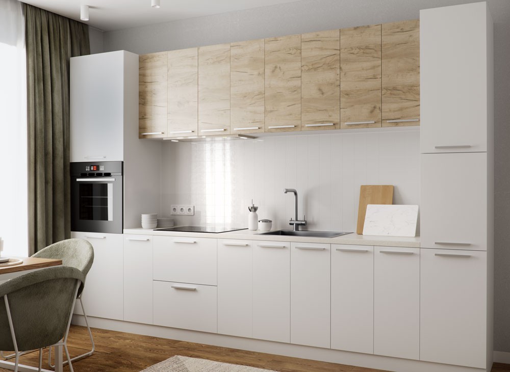 Фасади кухні “Родос” виготовлені з ДСП товщиною 18 мм та доповнюються стильною ручкою, що в сумі формує доступний варіант за ціною. Завдяки горизонтальній спрямованості ліній ручки та текстури дерева, фасади «Родос», навіть у невеликій кухні, візуально розширюють простір, надають відчуття рівноваги та стилю.