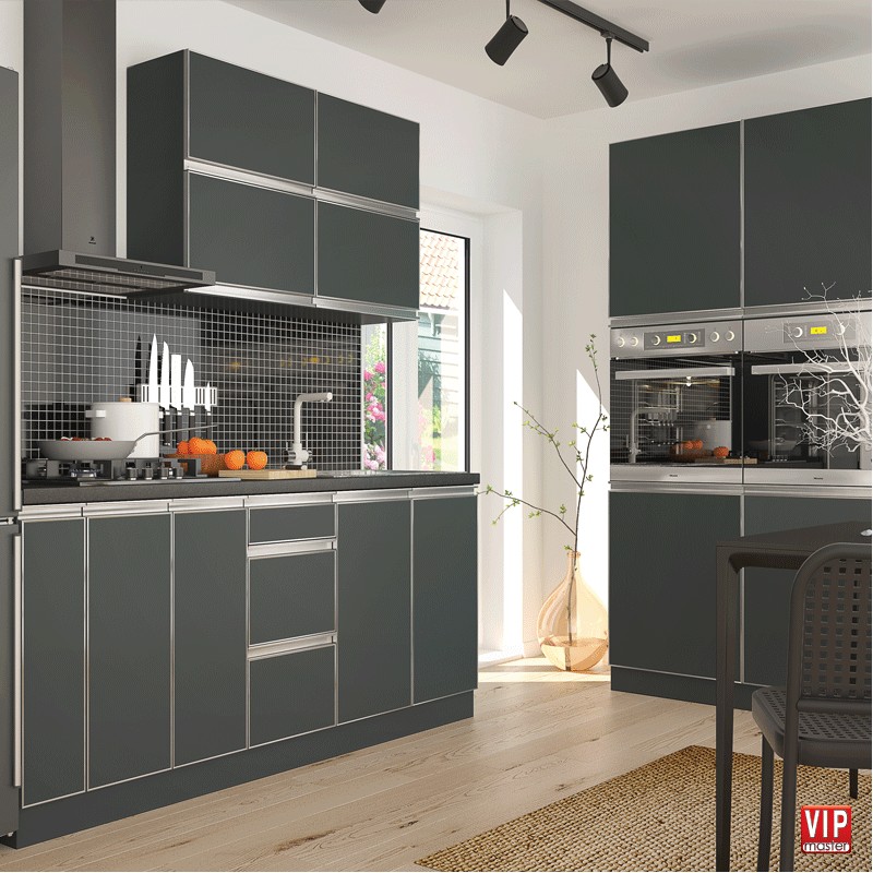 Кухні «Alta» с матовими фасадами в алюмінієвій рамці — модне й водночас практичне рішення. Такі фасади монтуються з алюмінієвого профілю, який і виконує роль рамки, та укладеного в нього наповнення з ламінованого ДСП.