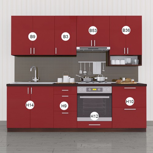 Корпус кухні виготовлено з ламінованого ДСП товщиною 16мм (виробник Swisspan), торці поклеєні кромкою ПВХ товщиною 0,6мм (виробник REHAU Германія). Стільниці 28 та 38мм неводостійкі, виробництва Krono Україна.У нас також можете змінити стільницю та фурнітуру на європейську (Egger, Lux Form, Blum, Heffele), змінити колір фасадів, розміри стандартних моділів, а також ми допоможемо коректно розмістити їх, взявши за основу Ваші побажання.