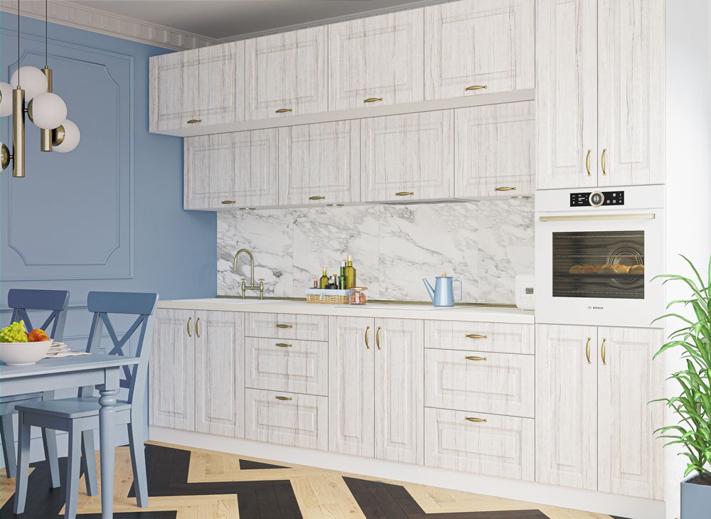 Корпус кухні виготовлено з ламінованого ДСП товщиною 16мм (виробник Swisspan), торці поклеєні кромкою ПВХ товщиною 0,6мм (виробник REHAU Германія). Стільниці 28 та 38мм неводостійкі, виробництва Krono Україна.У нас також можете змінити стільницю та фурнітуру на європейську (Egger, Lux Form, Blum, Heffele), змінити колір фасадів, розміри стандартних моділів, а також ми допоможемо коректно розмістити їх, взявши за основу Ваші побажання.