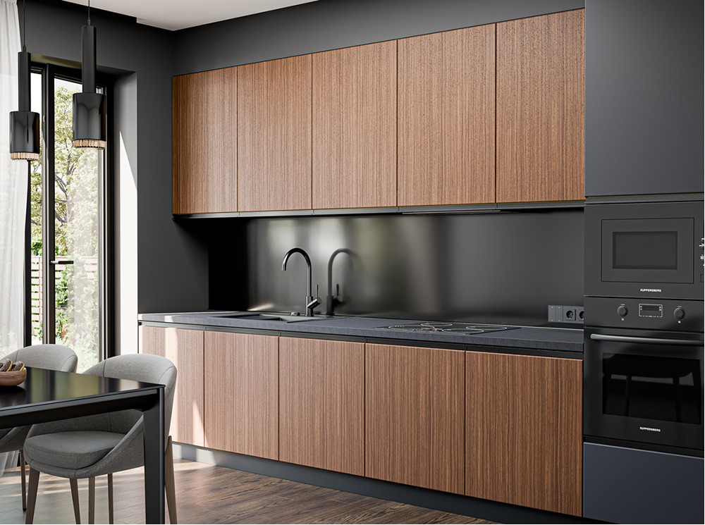 Кухня Лорі — це поєднання природної естетики та сучасного дизайну. Фасади виконані зі шпону з інтегрованою алюмінієвою ручкою у двох варіантах: чорна (BL) або золота (GL). Натуральна текстура шпону додає інтер’єру тепла й затишку, при цьому зберігаючи актуальність сучасного стилю. Фасади Лорі чудово комбінуються з кухнею Прайм, адже мають однаковий алюмінієвий профіль-ручку. Такий дует відкриває широкі можливості для дизайну — шпон легко доповнюється глибокими або нейтральними відтінками фарбованого МДФ, створюючи гармонійну і водночас ефектну композицію.