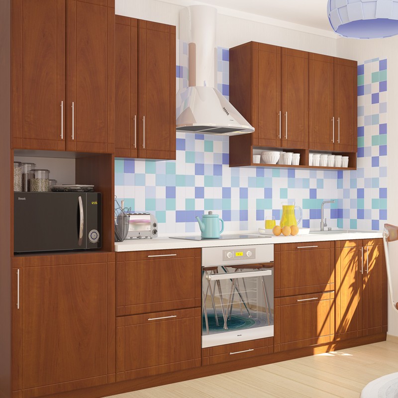 Корпус кухні виготовлено з ламінованого ДСП товщиною 16мм (виробник Swisspan), торці поклеєні кромкою ПВХ товщиною 0,6мм (виробник REHAU Германія). Стільниці 28 та 38мм неводостійкі, виробництва Krono Україна.У нас також можете змінити стільницю та фурнітуру на європейську (Egger, Lux Form, Blum, Heffele), змінити колір фасадів, розміри стандартних моділів, а також ми допоможемо коректно розмістити їх, взявши за основу Ваші побажання.