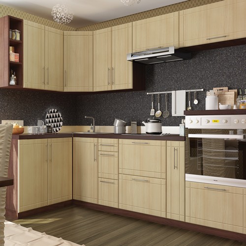 Деревоподібний декор фасадів “Maxima” нейтральної кольорової гами, а також правильна геометрична форма кухонних модулів чудово вписуються як у класичний інтер’єр, так і в сучасний модерн. Для такої кухні характерний елегантний мінімалізм без вигадливого оздоблення. Вона приваблює своєю стриманістю та гармонійністю і підходить як для просторого, так і для скромного за своїми розмірами приміщення, де всі об’єкти та предмети узгоджені між собою — вони ніби підкоряються єдиній ідеї, спрямованій на те, щоб створити логічне і гармонійне відчуття комфорту, в якому немає жодної випадкової деталі.