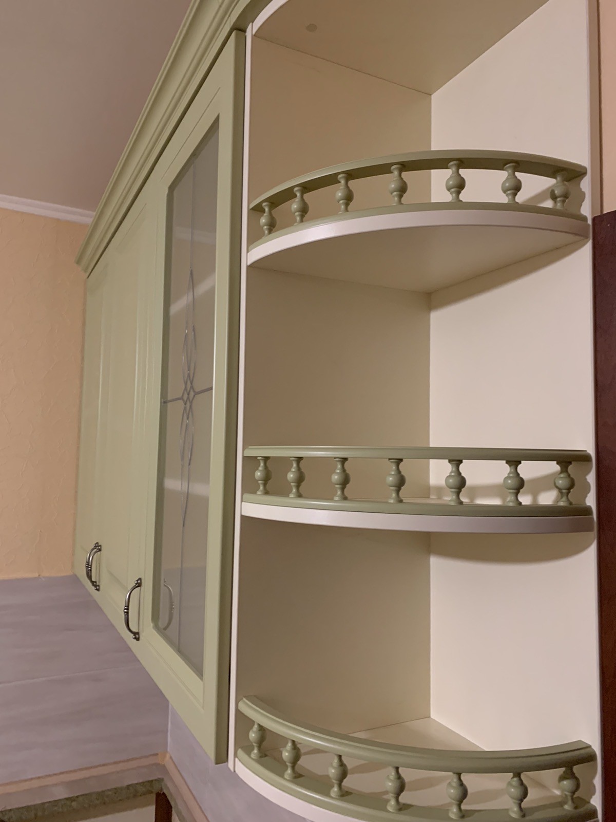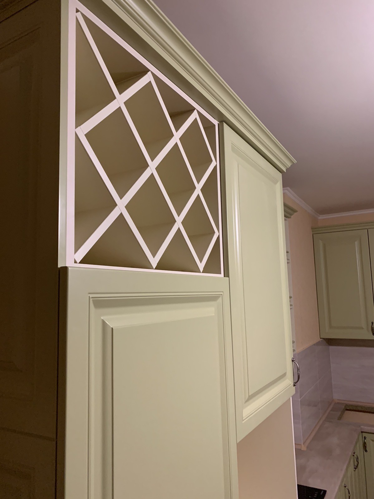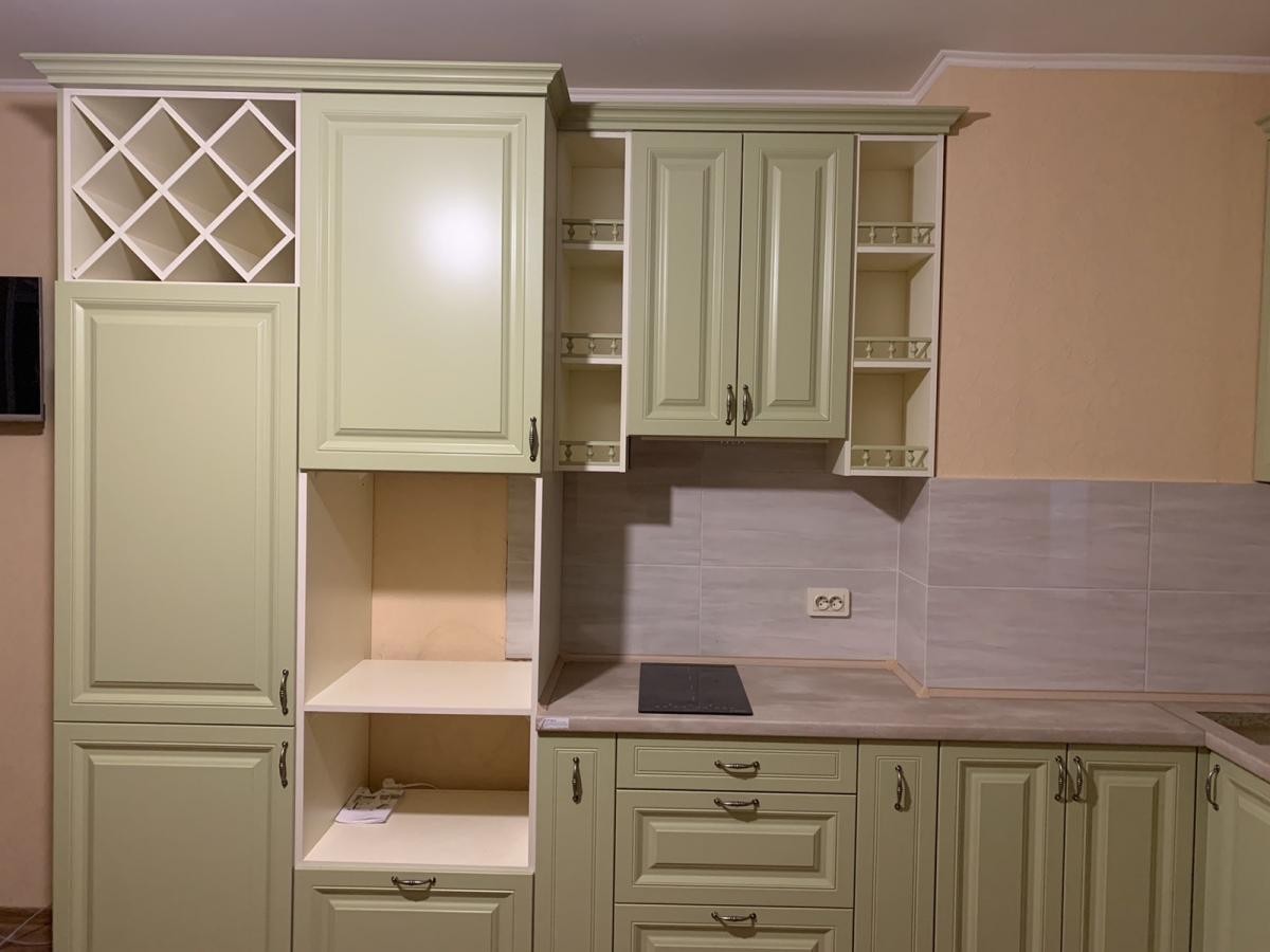 Кухня «Мелані» фарбована. Виконана в фісташковому кольорі з балюстрадами, холодильник вбудований.