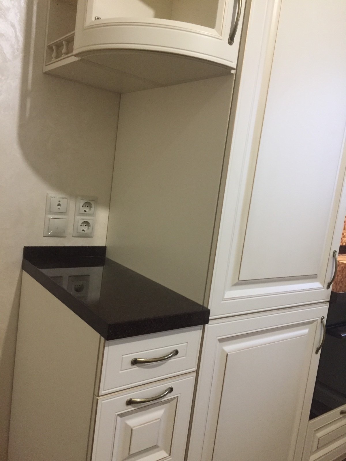 Кухня Мелані на замовлення , фарбована в кольорі слонова кістка, патина золото.Кухня розмістилась на невеличкій площі, стільниця зі штучного каменю лаконічно об‘єднує кухню з вікном,заміщуючи підвіконня та розширюючи простір.