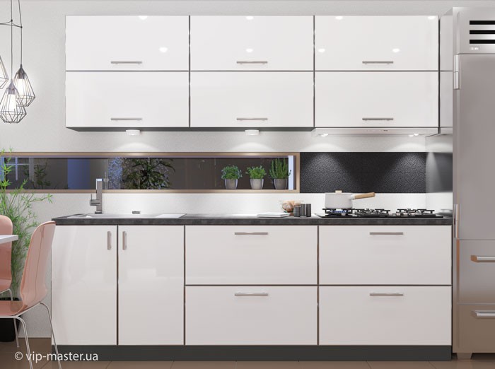 Кухня «Mirror Gloss» - лаконічний глянець в алюмінієвому профілі. Це фасади з ламінованого ДСП товщиною 18 мм з кольоровим глянцевим покриттям з обох сторін (KronoSpan) в алюмінієвому профілі по периметру. 9 кольорів від ніжних до яскравих створять неповторний стиль, який задовольнить смак сучасного покупця, і алюмінієва рамка, додасть додатковий візуального визначення, збільшить надійність і зручність експлуатації кухні.