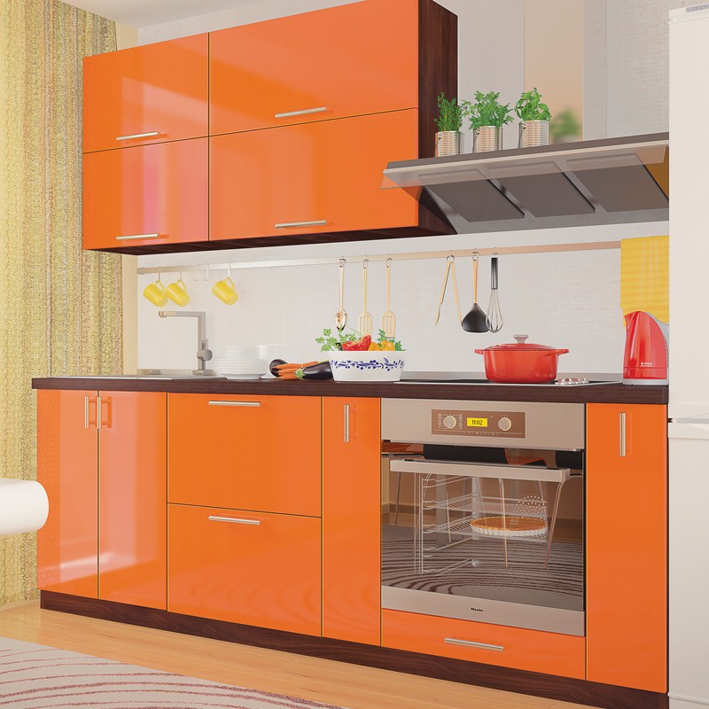 Кухонні фасади, декоровані плівкою ПВХ, вибирають дбайливі господарі, які прагнуть нових рішень, але не бажають витрачати на меблі для кухні значну суму. Бюджетно й естетично — завдяки цим двом перевагам глянцеві плівкові фасади сьогодні домінують на меблевому ринку та стають хітами продажів. Увагу покупців також приваблює вражаюча тональна палітра. Ми пропонуємо фасади 18 кольорів, і в основному це яскраві та активні, кілька з них — з ефектом металік. Великі глянцеві поверхні верхніх модулів вдало комбінуються з вітринами із матового скла — скляні елементи ефектно виглядають та полегшують загальний інтер’єр. Завершує ансамбль релінгова ручка двох розмірів — для стандартних та широких горизонтальних фасадів.