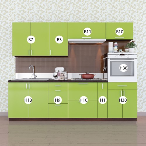 Корпус кухні виготовлено з ламінованого ДСП товщиною 16мм (виробник Swisspan), торці поклеєні кромкою ПВХ товщиною 0,6мм (виробник REHAU Германія). Стільниці 28 та 38мм неводостійкі, виробництва Krono Україна.У нас також можете змінити стільницю та фурнітуру на європейську (Egger, Lux Form, Blum, Heffele), змінити колір фасадів, розміри стандартних моділів, а також ми допоможемо коректно розмістити їх, взявши за основу Ваші побажання.