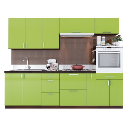 Кухонні фасади, декоровані плівкою ПВХ, вибирають дбайливі господарі, які прагнуть нових рішень, але не бажають витрачати на меблі для кухні значну суму. Бюджетно й естетично — завдяки цим двом перевагам глянцеві плівкові фасади сьогодні домінують на меблевому ринку та стають хітами продажів. Увагу покупців також приваблює вражаюча тональна палітра. Ми пропонуємо фасади 18 кольорів, і в основному це яскраві та активні, кілька з них — з ефектом металік. Великі глянцеві поверхні верхніх модулів вдало комбінуються з вітринами із матового скла — скляні елементи ефектно виглядають та полегшують загальний інтер’єр. Завершує ансамбль релінгова ручка двох розмірів — для стандартних та широких горизонтальних фасадів.