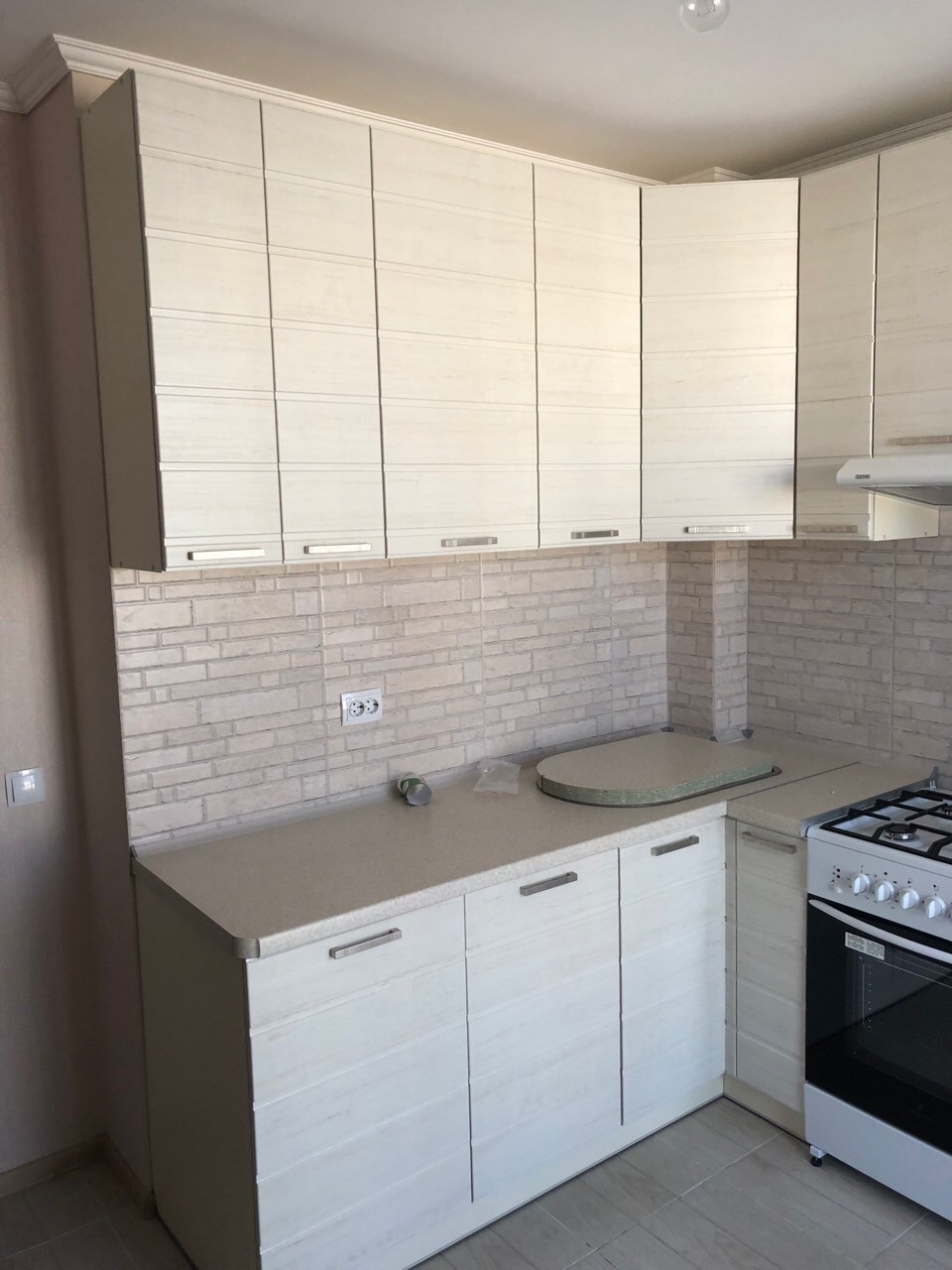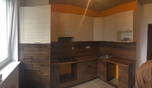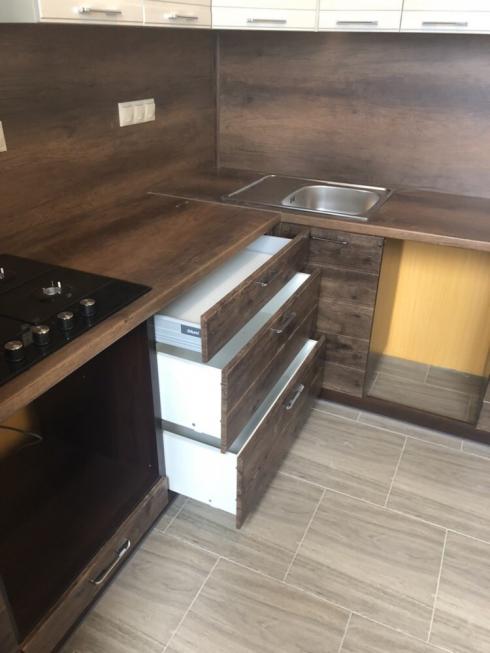 Корпус кухні виготовлений з ламінованого ДСП товщиною 16 мм (виробник Swisspan), торці поклеєні крайкою ПВХ товщиною 0,6 мм (виробник REHAU Німеччина) та зібрані на кріплення конфірмат. Внутрішні деталі ДСП, ДВП білого кольору. Кухонні фасади - декоровані плівкою ПВХ.
