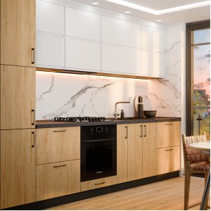 Нова колекція кухонь зі шпонованими фасадами – елегантність та довговічність! Пропонуємо вашій увазі нашу новинку – кухні «Sonata» з шпонованими фасадами! Шпон – це натуральний матеріал, який надає фасадам вишуканого вигляду та забезпечує їхню довговічність. Він ідеально передає текстуру дерева, поєднуючи природну естетику з високою стійкістю до зовнішніх впливів. Кожен фасад ретельно оброблений, щоб підкреслити унікальну фактуру деревини, додаючи інтер’єру розкішний і сучасний вигляд.