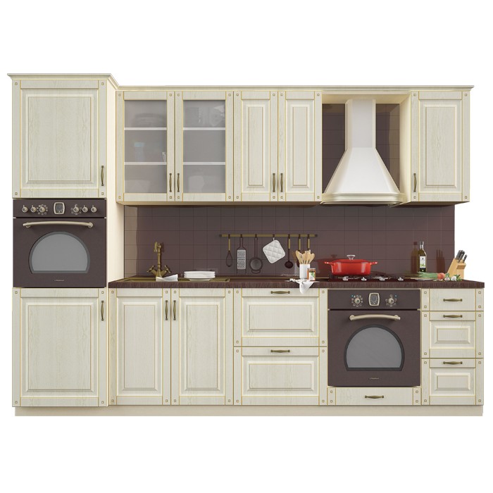 Кухня “Сопрано” - це чудовий вибір стриманої класики для вашої оселі, адже фасади кухні “Сопрано” це поєднання чітких форм та легкої грації у класичному дизайні. Корпус кухні виготовлений з ламінованого ДСП товщиною 16 мм (виробник Swisspan), торці поклеєні крайкою ПВХ товщиною 0,6 мм (виробник REHAU Німеччина) та зібрані на кріплення конфірмат. Внутрішні деталі ДСП, ДВП білого кольору. Кухонні фасади — декоровані плівкою ПВХ, у срібній та золотій патині.