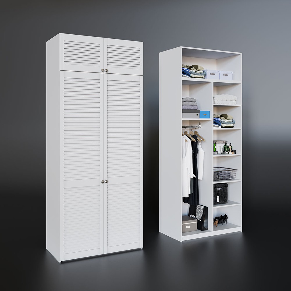 Розпашна шафа Техас з жалюзійними фасадами стане прикрасою будь-якого інтер’єру. Фасади Техас виготовлені з натурального дерева і мають два кольори на вибір – білий або антрацит. Горизонтальні планки не тільки роблять інтер’єр цікавішим, але й забезпечують вентиляцію. Шафа Техас підійде до різних стилів дизайну, додавши елегантності кожному з них. Ви можете обрати розміри комплекту за своїм смаком, комбінуючи різні модулі.