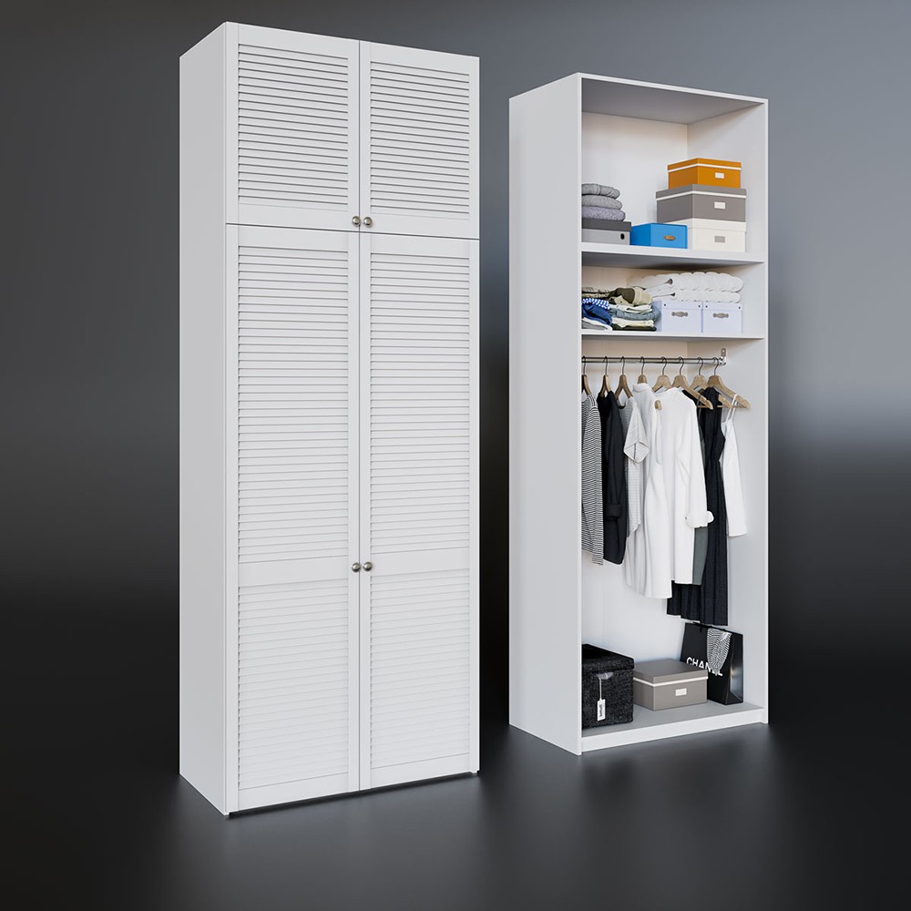 Розпашна шафа Техас з жалюзійними фасадами стане прикрасою будь-якого інтер’єру. Фасади Техас виготовлені з натурального дерева і мають два кольори на вибір – білий або антрацит. Горизонтальні планки не тільки роблять інтер’єр цікавішим, але й забезпечують вентиляцію. Шафа Техас підійде до різних стилів дизайну, додавши елегантності кожному з них. Ви можете обрати розміри комплекту за своїм смаком, комбінуючи різні модулі.