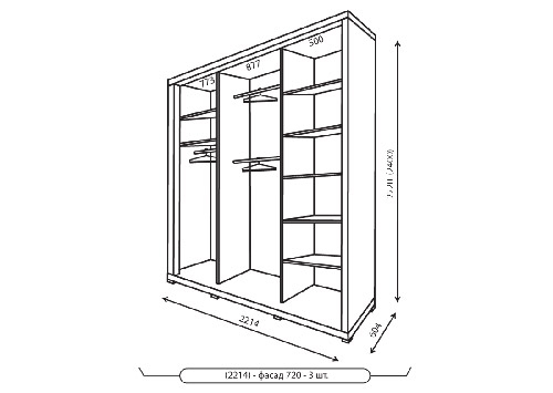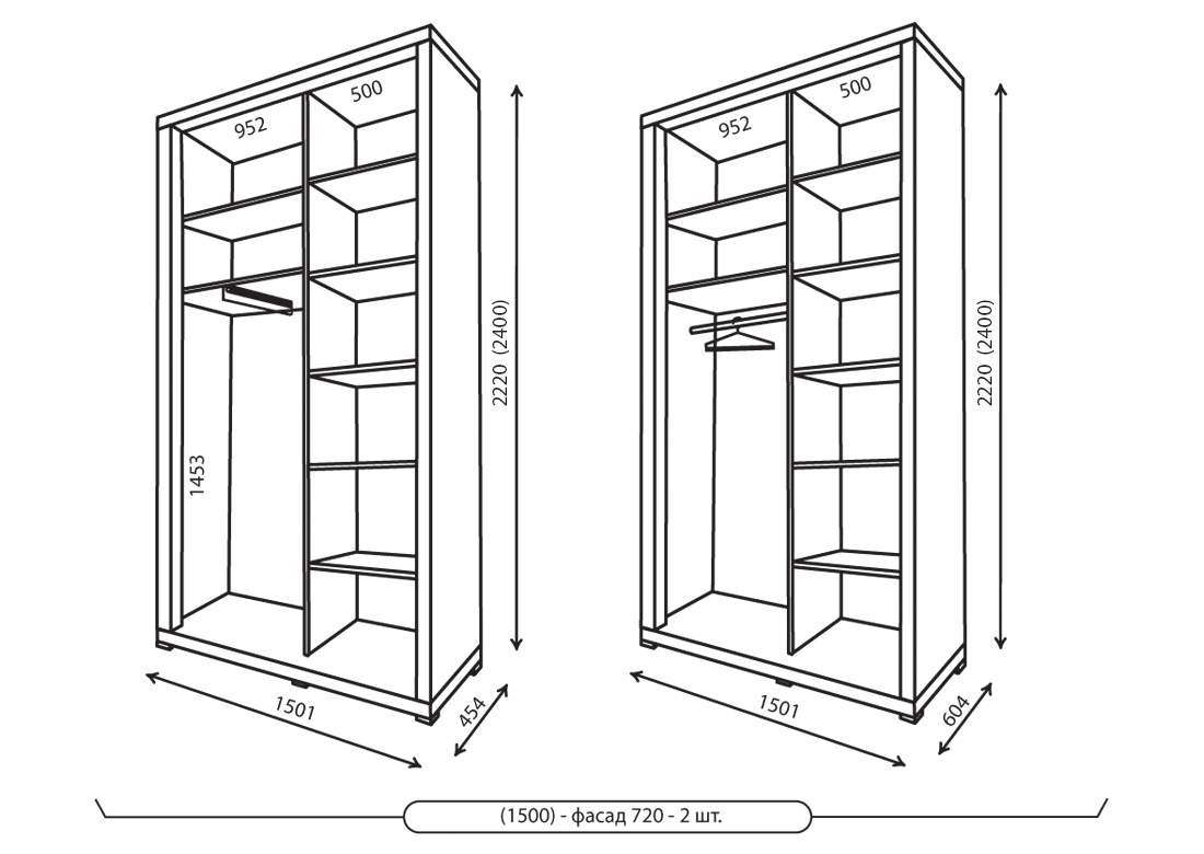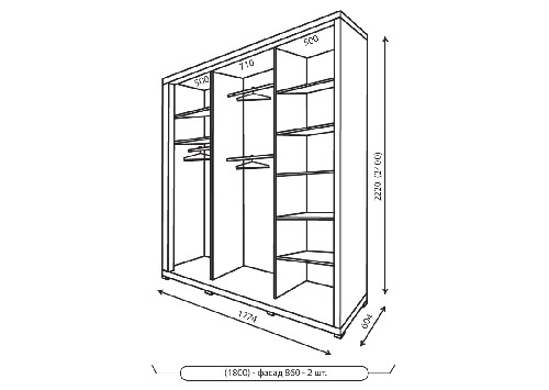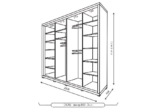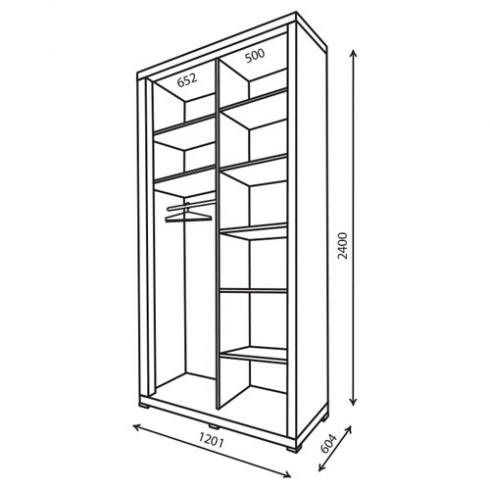 Корпус шафи виготовлений з ДСП товщиною 16 мм + 50 мм потовщення. Кромка ПВХ 1мм REHAU (Німеччина) Наповнення шафи-купе в білому кольорі (ДСП біле, ДВП біле). Зібраний на кріпленні конфирмат. Шафа-купе глибиною 450 комплектується висувною вішалкою (мікроліфт). Шафа-купе глибиною 600 комплектується штангою. Додаткові опції (на вибір): висувні ящики, стопора, затиск для щітки розсувної системи.