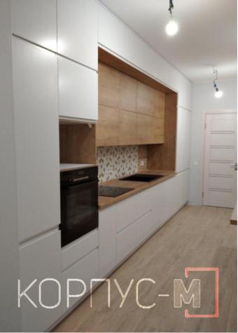 Кухня виконана на замовлення з використанням стільниці та робочої стінки Бетон Еггер. Деревоподібна структура вбудованих шаф та підсвітка пом’якшує і розріджує чіткі прямі форми кухонного гарнітуру, що створює більш затишний інтер’єр самої кухні. Фасадна частина вифарбувана світло-сірим глянцевим кольором, що ідеально поєднується з світло-сірим корпусом кухонних модулів. Хай довго служить та радує погляд власникам і гостям оселі!