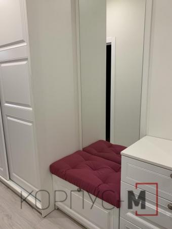 Меблі на замовлення у передпокій. Зона біля порогу, з вмісткими шафами, лаконічно розмістилась в ніші, розділяючи та головне не загромаджуючи простір. Світлий колір додатково створює ефект легкості, а дякуючи м‘якому сидінню, одягати взуття ще комфортніше!