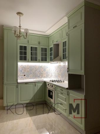 Кухня «Мелані» фарбована. Виконана в фісташковому кольорі з балюстрадами, холодильник вбудований.