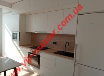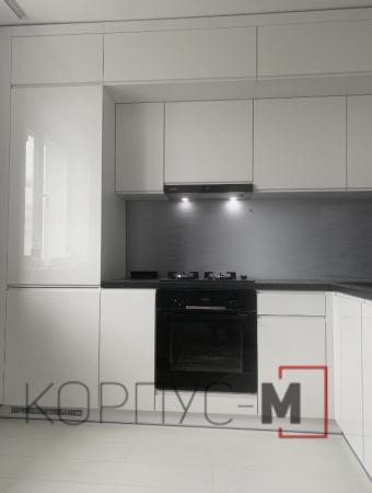 Виконана на замовлення з фарбованих, глянцевих фасадів. Білий колір в глянцевому виконанні підкреслює чіткість ліній та візуально збільшує розмір приміщення. Стільниця - Арабіскато Люксформ, водостійка. Фурнітура - Blum (Австрія) з довідниками.