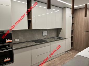Кухня Флет зі зміною ручки та підсвіткою.Верхні модулі відчиняються дотиком руки для більшого комфорту і лаконічності гарнітуру.