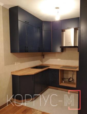 Зручна та компактна кухня на замовлення! Вишуканості додають фарбовані матові фасади темно - синього кольору.