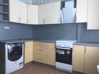 Яскравий кухонний гарнітур для невеликої кухні. Фарбовані глянцеві фасади насиченого жовтого кольору стильно поєднуються з чорною стільницею та чорними лаконічними ручками. За допомогою радіусів вдалося уникнути гострих кутів при розробці острівця. Кухня вдало розмістилась, вся площа використана грамотно, візуально не зменшивши приміщення.