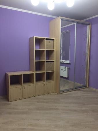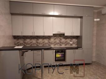 Фасади виконані в ніжному, рожевому кольорі, який стильно поєднується з ДСП (сірий бетон Егер). Направляючі та петлі від марки Блюм.