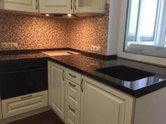 Кухонний гарнітур у класичному стилі.Фасади Мелані, фарбовані в кольорі слонова кістка, патина золото.Кухня розмістилась на невеличкій площі, стільниця зі штучного каменю лаконічно об‘єднує кухню з вікном,заміщуючи підвіконня та розширюючи простір.