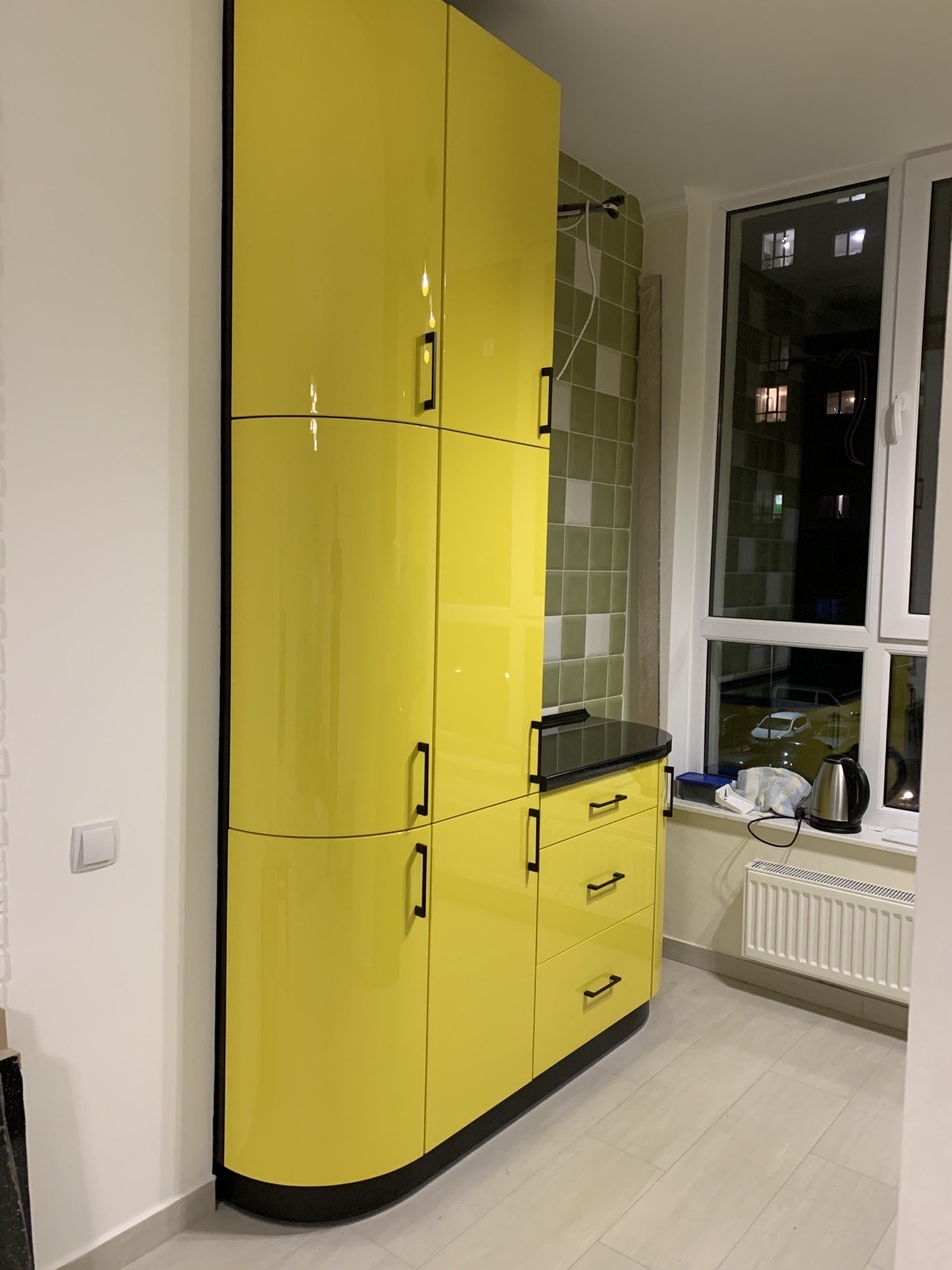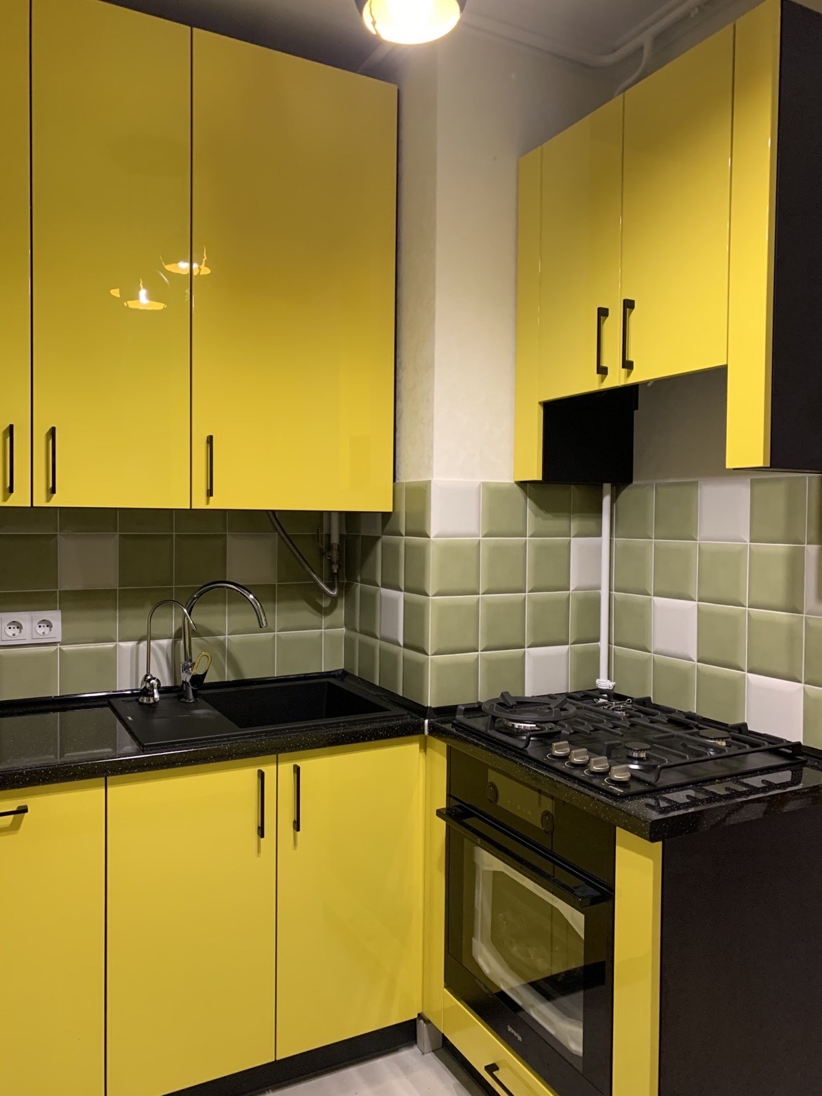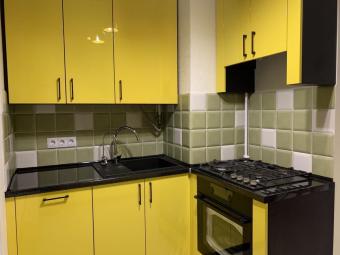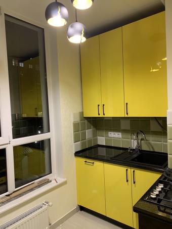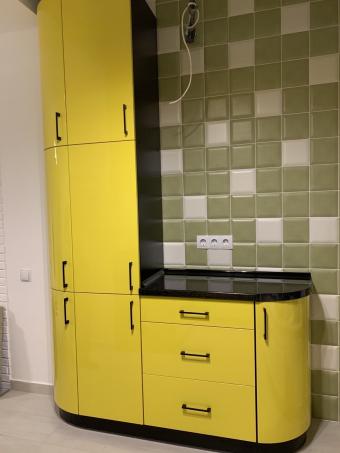Яскравий кухонний гарнітур для невеликої кухні. Фарбовані глянцеві фасади насиченого жовтого кольору стильно поєднуються з чорною стільницею та чорними лаконічними ручками. За допомогою радіусів вдалося уникнути гострих кутів при розробці острівця. Кухня вдало розмістилась, вся площа використана грамотно, візуально не зменшивши приміщення.