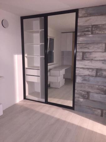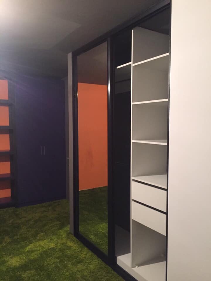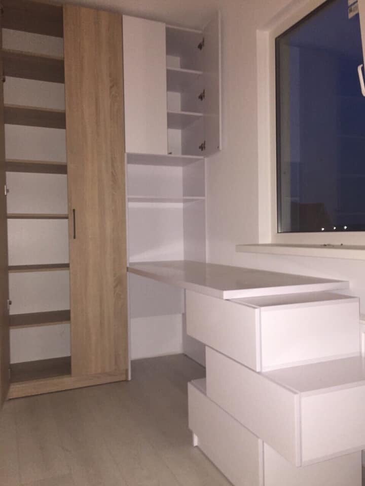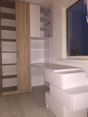 Завдяки правильно підібраним параметрам шаф, полиць та кольору виробів вдалось досягти візуального ефекту великого приміщення.