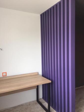 Вся квартира, розпочинаючи зі стола з хаотичним розміщенням поличок і закінчуючи нетиповою перегородкою в благородних фіолетових тонах - є втілення фантазії нашого Клієнта.