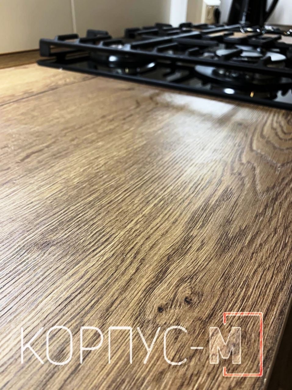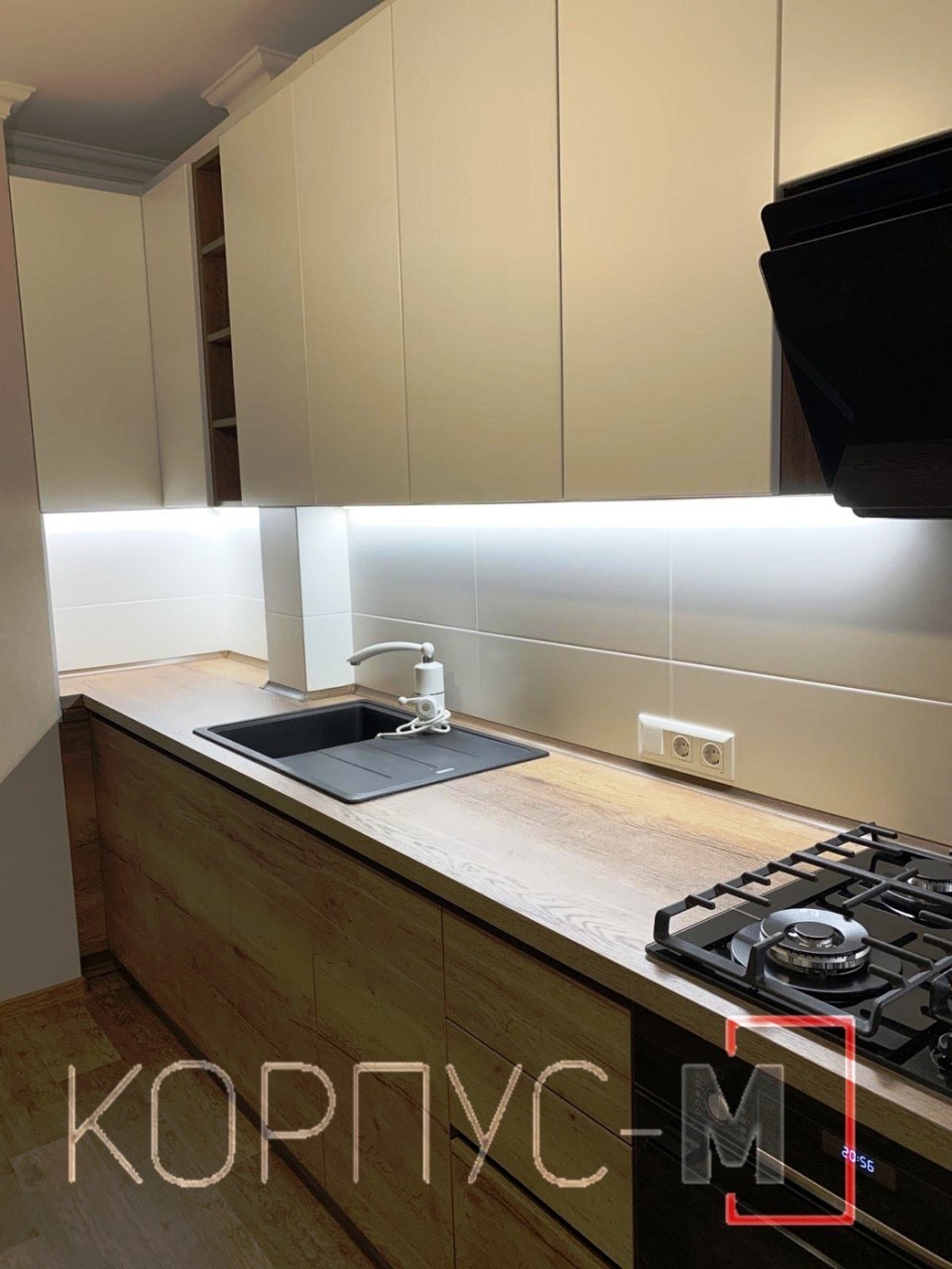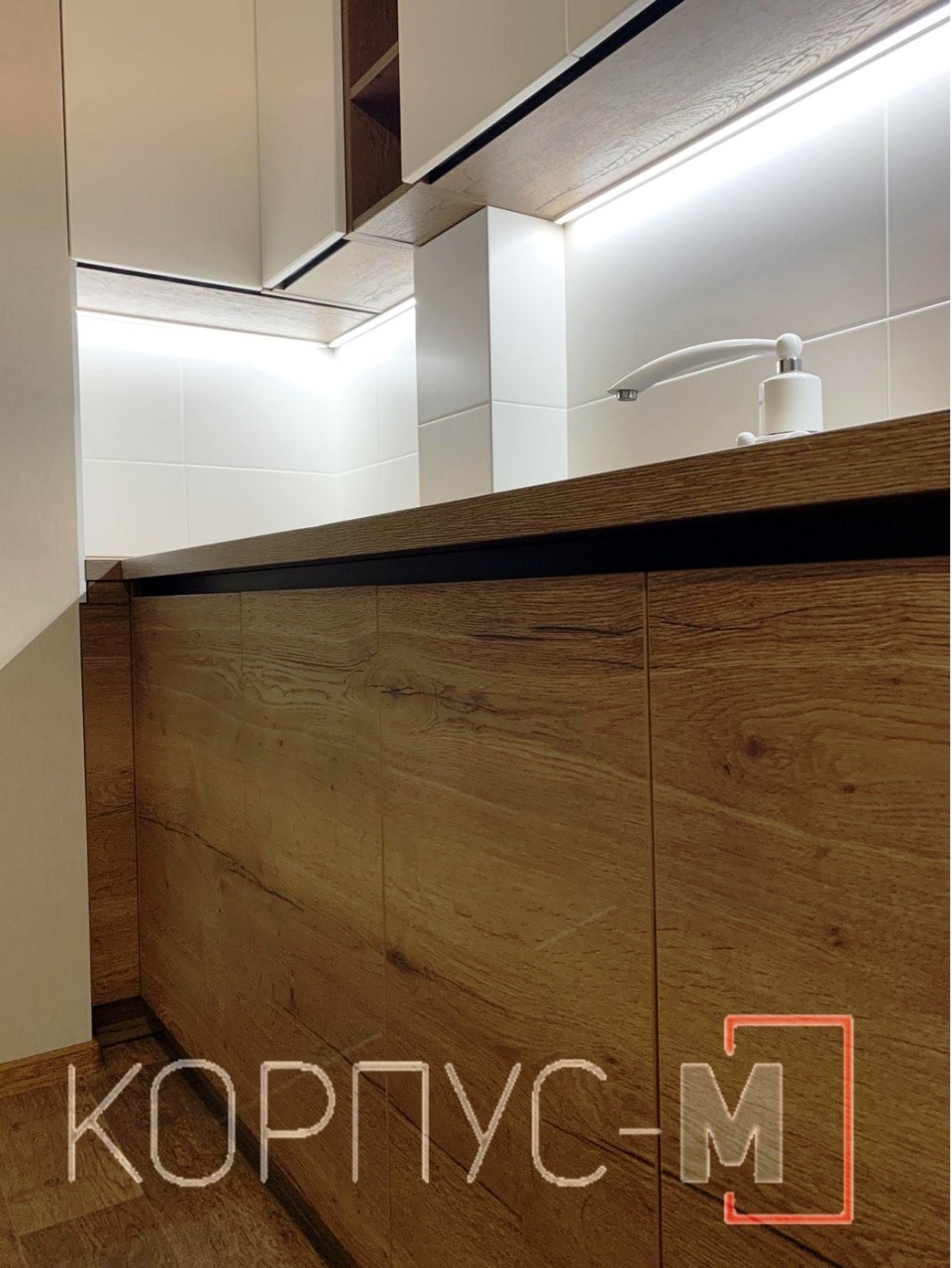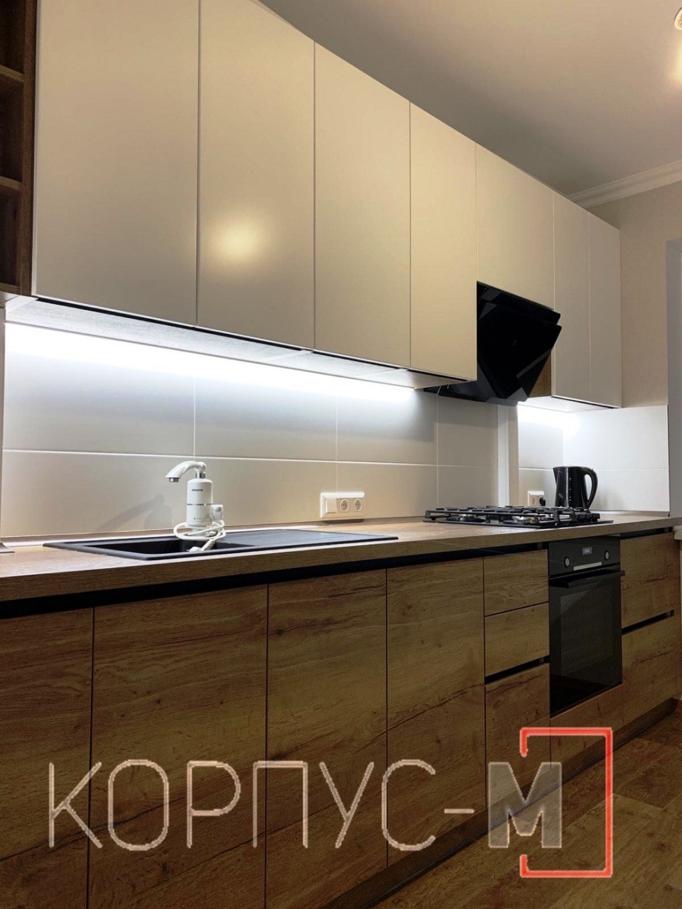 Продовжуємо поєднувати деревоподібну структуру з гладкими формами. Кухня виготовлена з використанням плит ДСП та стільниці Егер у кольорі Дуб Галіфакс Табака, верхні фасади - матова фарба . Прихована ручка виготовлена з алюмінієвого профілю в чорному кольорі, а верхні секції відчиняються дотиком. Підсвітка робочої зони завершує кухонний гарнітур. Зручно та лаконічно!