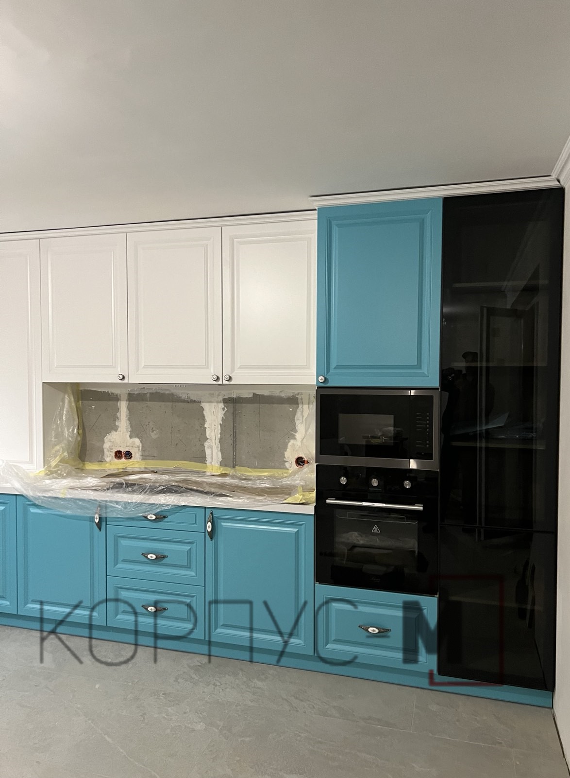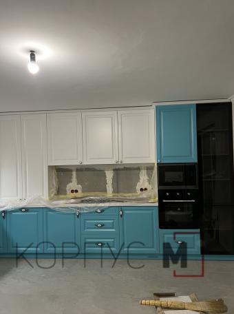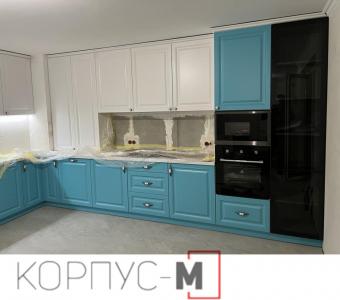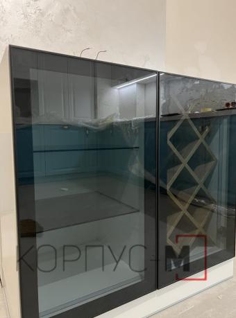 Кухня Браво з фасадами у замовному кольорі та декоративними ручками. Стильний бар, з відкритими вітринами тонованого скла, додає родзинки класичному виконанню кухні.