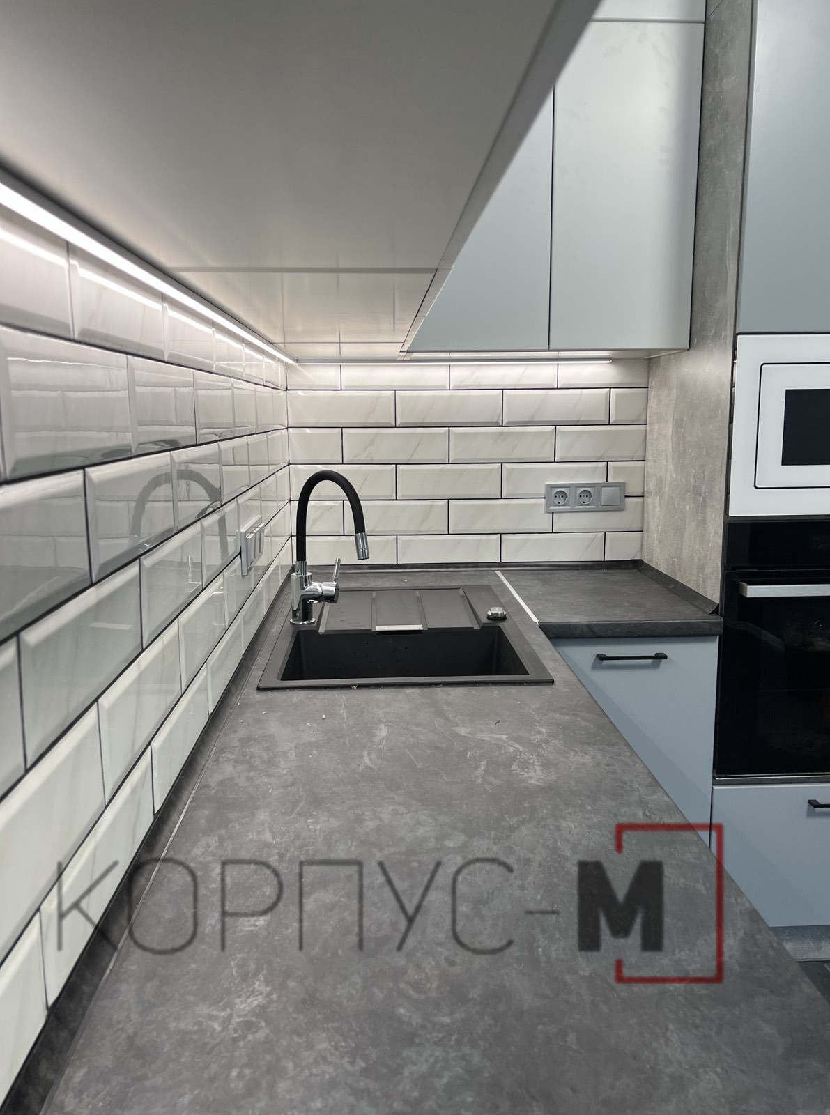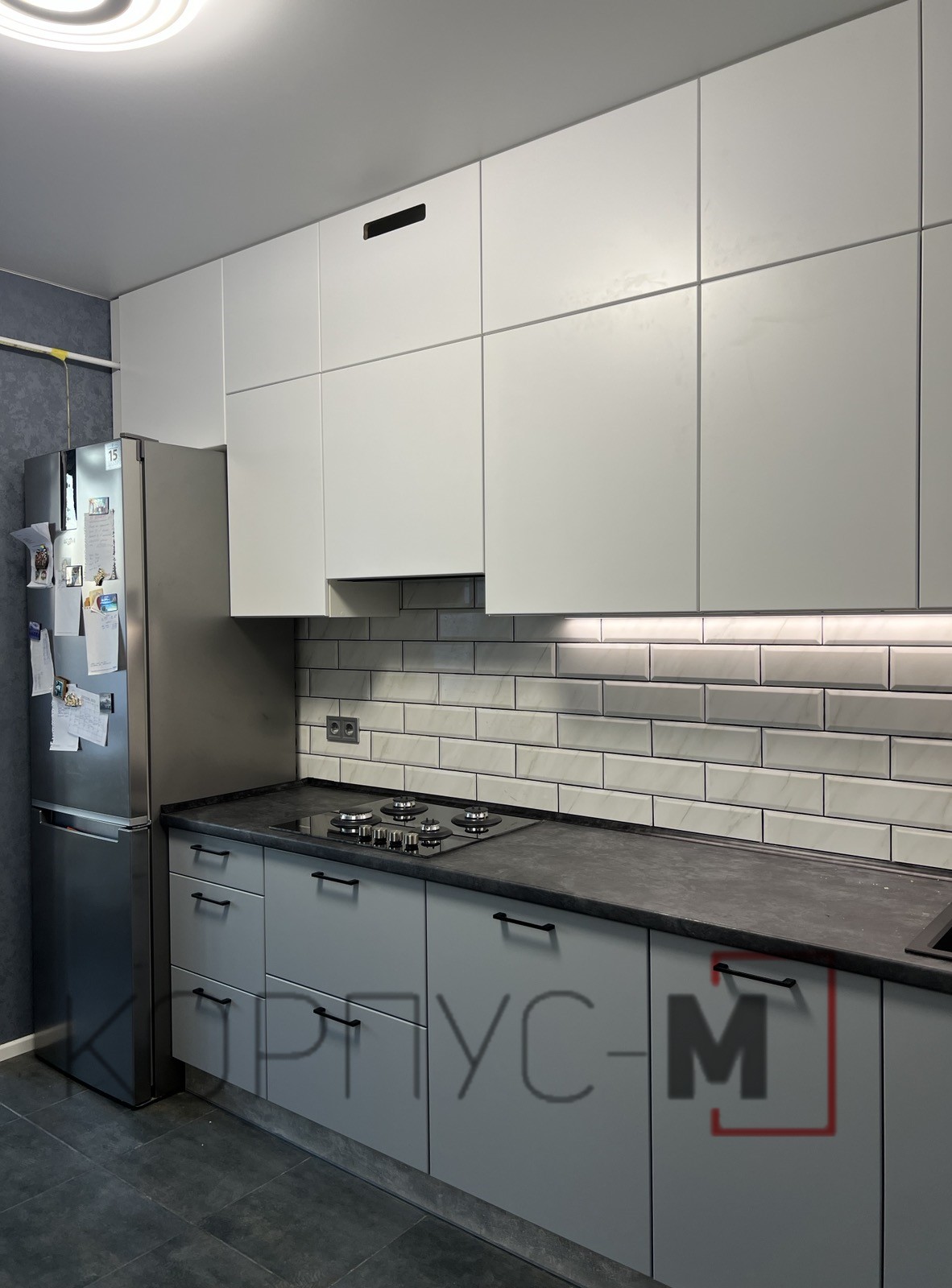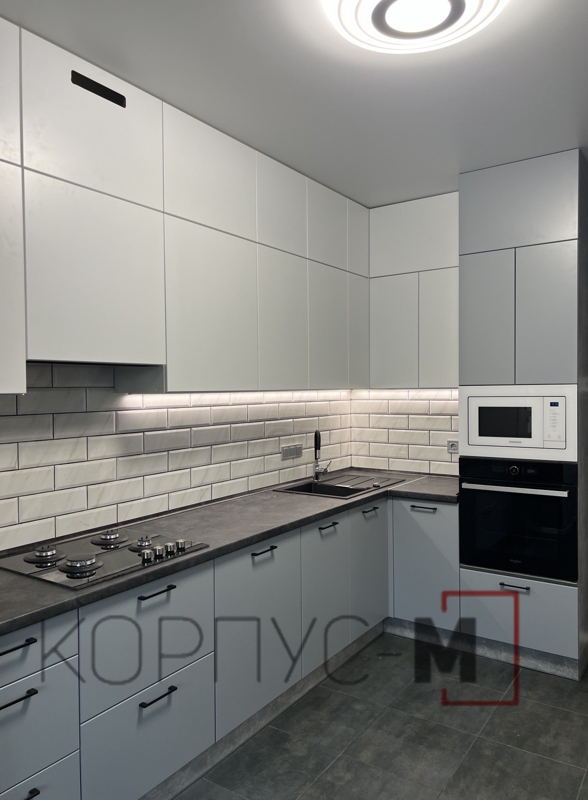 Кухня Флет зі зміною ручки та підсвіткою.Верхні модулі відчиняються дотиком руки для більшого комфорту і лаконічності гарнітуру.