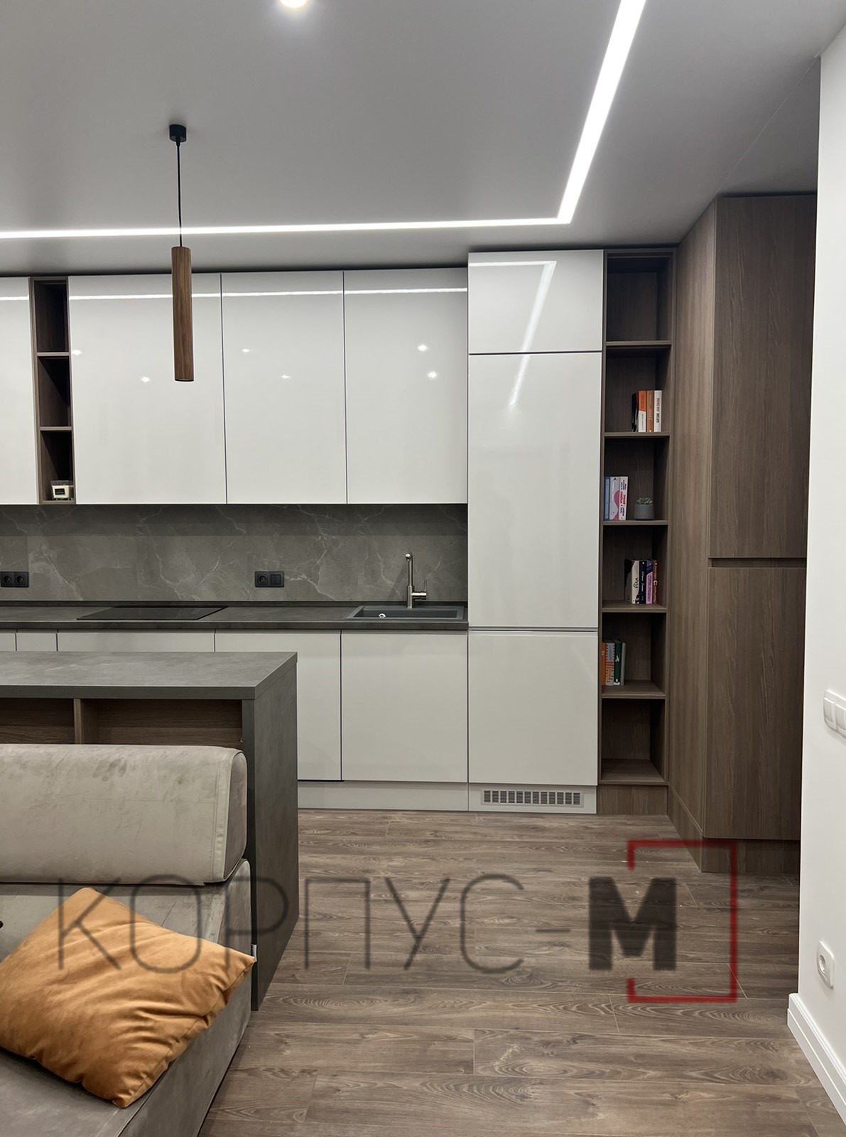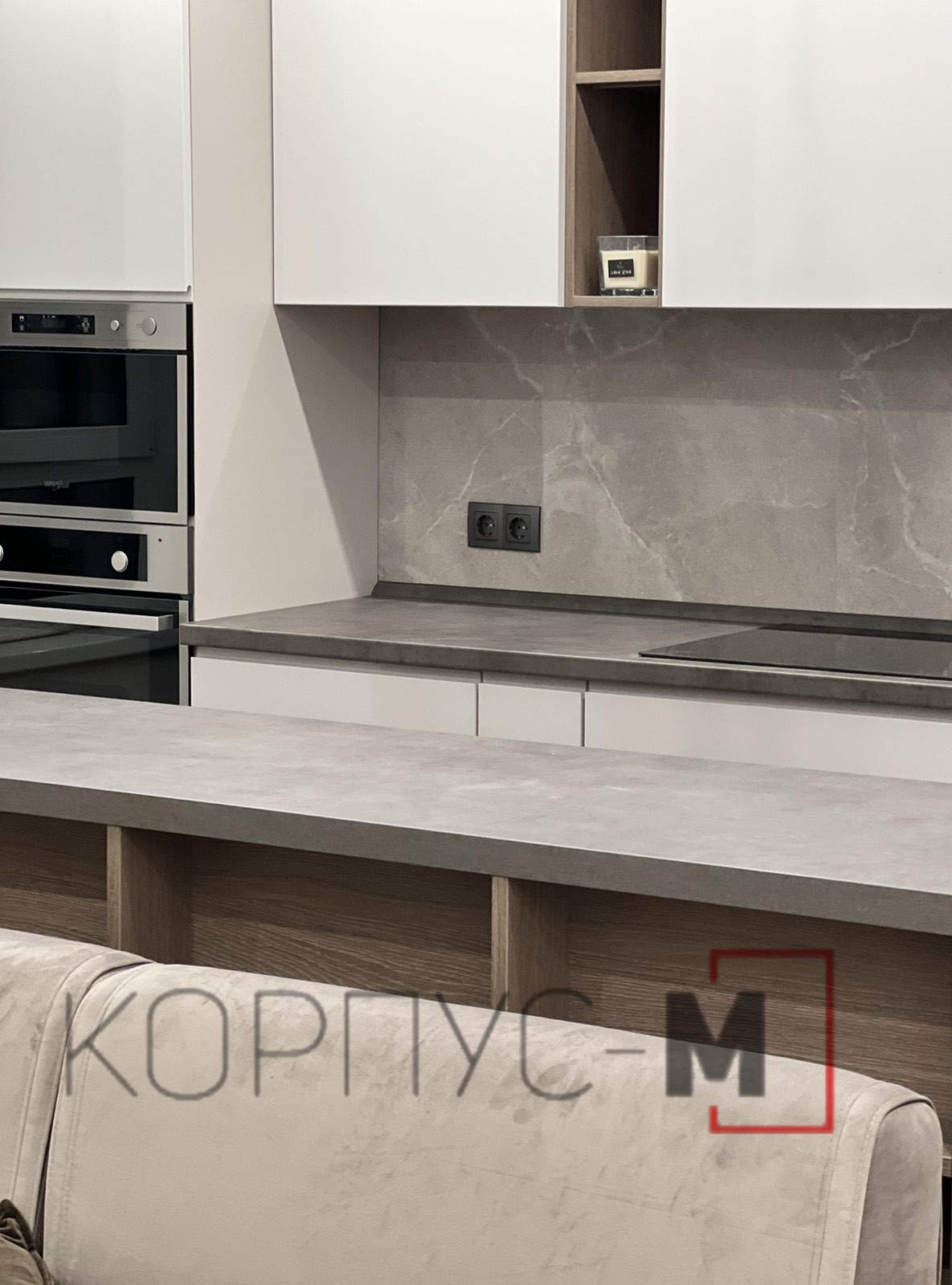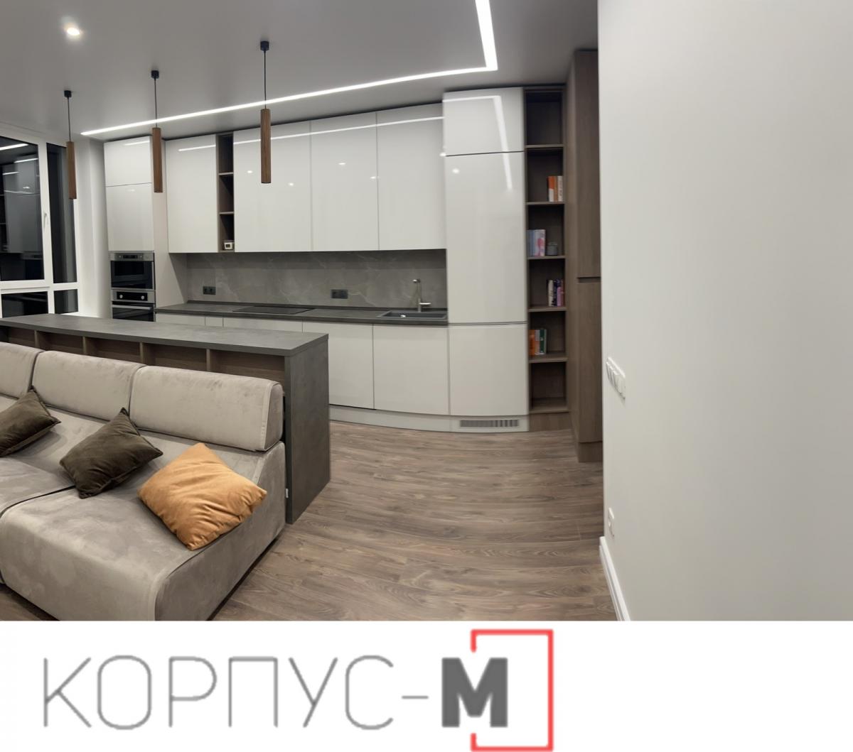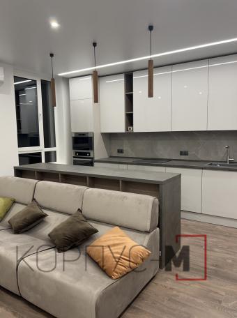 Кухня Iнтерно/Interno на замовлення. Глянцеві молочні фасади власного виробництва, стільниця Бетон Чикаго темно-сірий, виробництва Еггер.