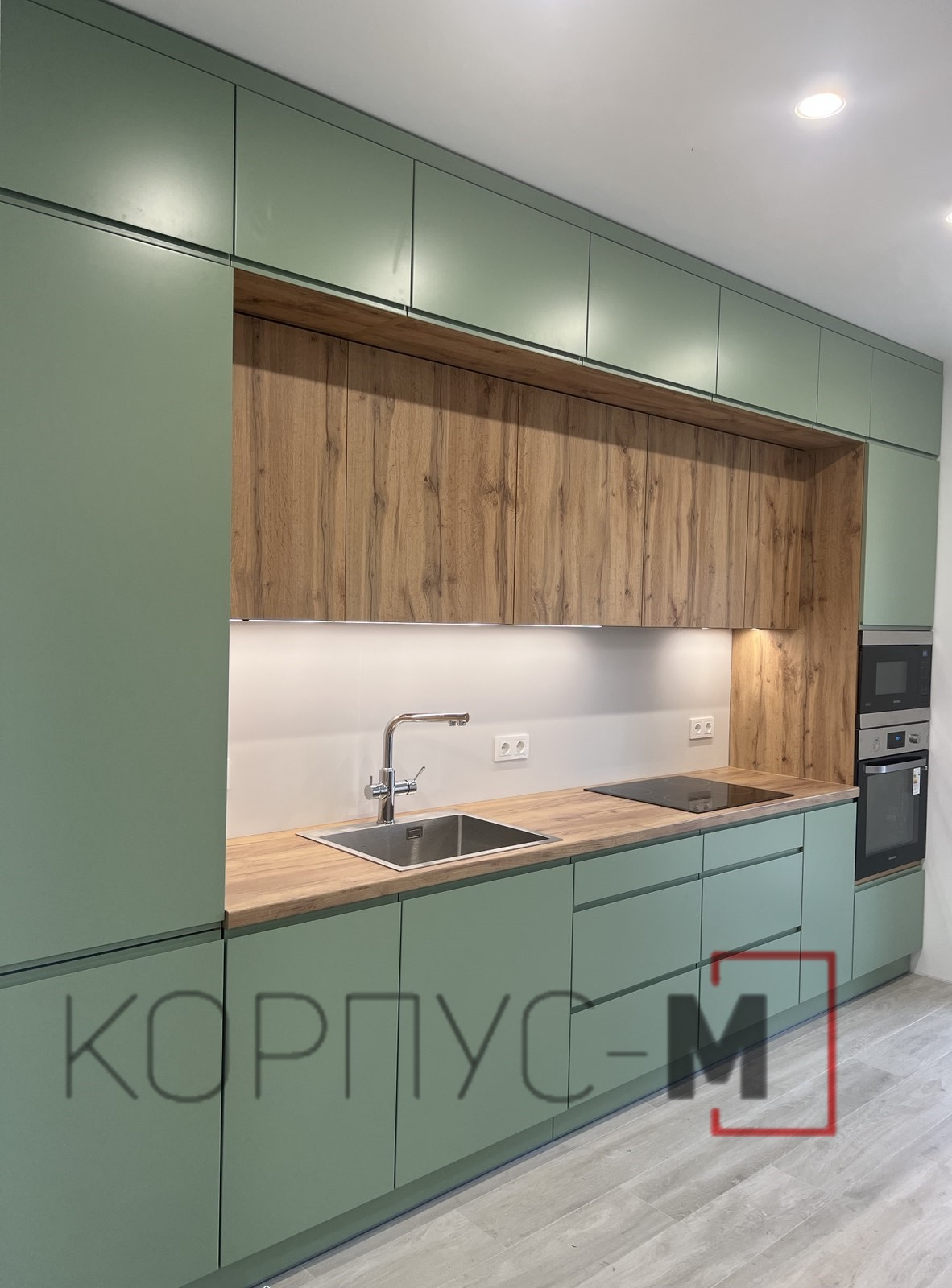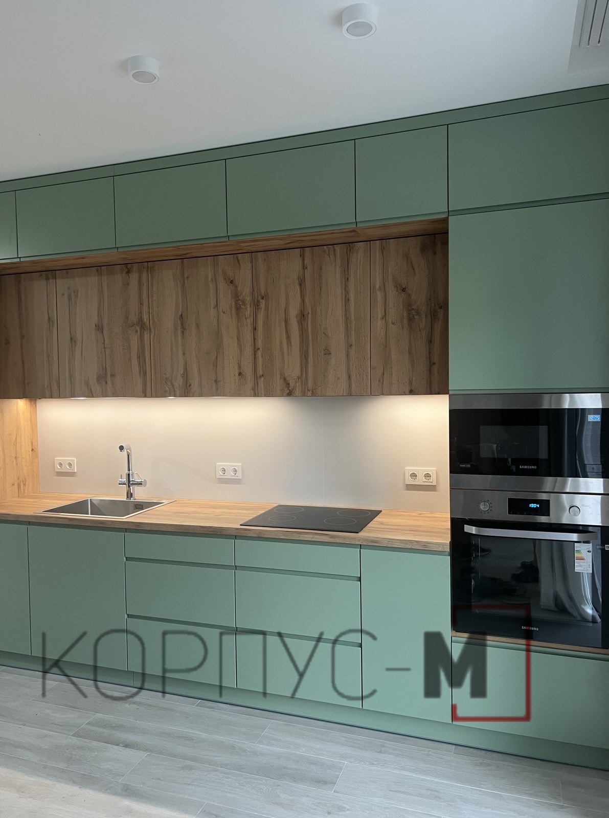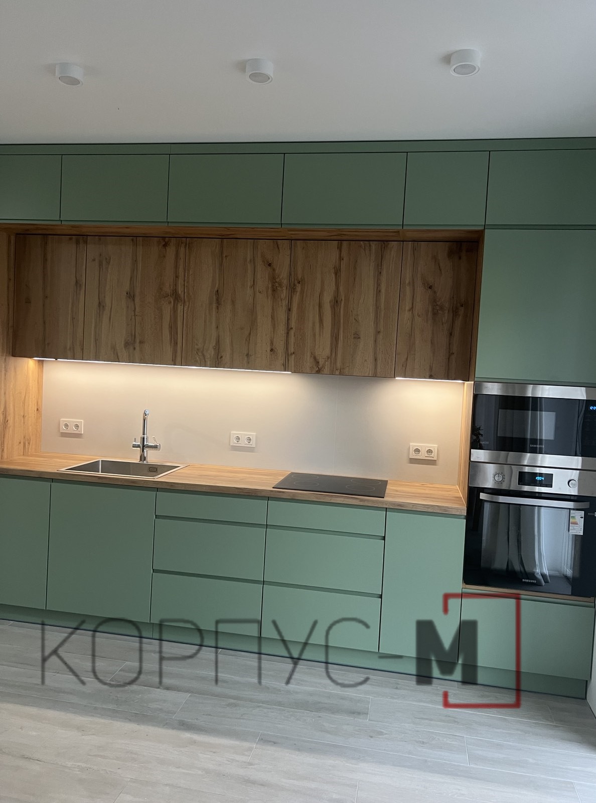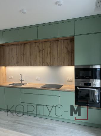Кухня Інтерно/Interno під замовлення. Фарбовані матові фасади з інтегрованою ручкою.Стільниця гармонійно поєднується з деревоподібним корпусом та стіновою панеллю, а підсвітка додає затишку і тепла при приготуванні страв або ж просто перебуванні на кухні.