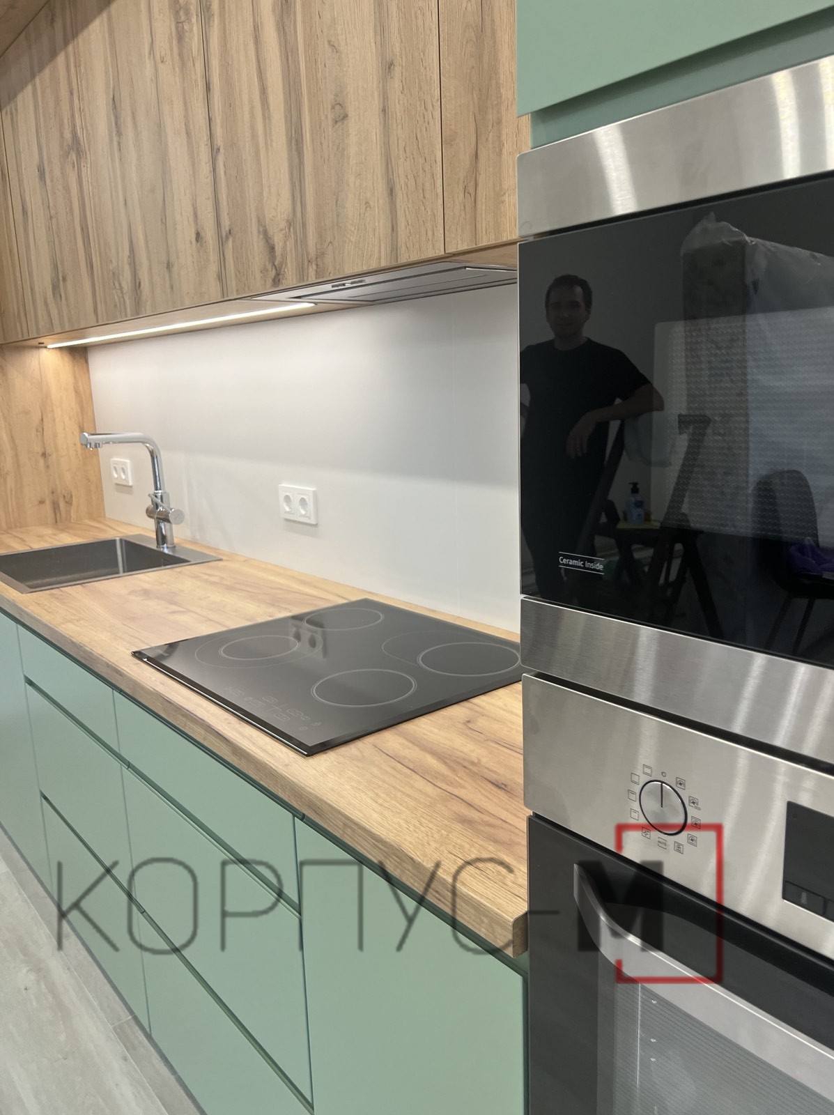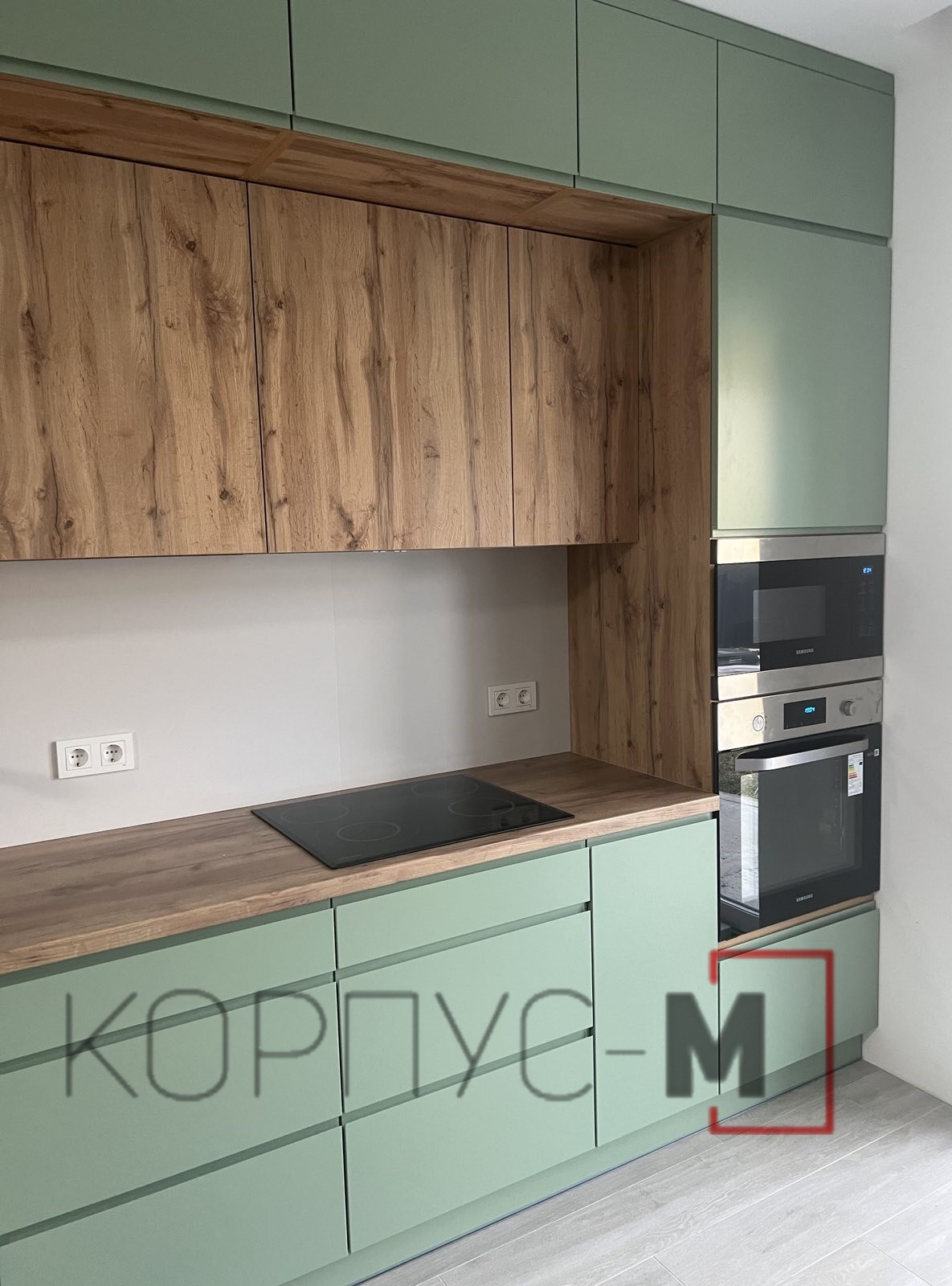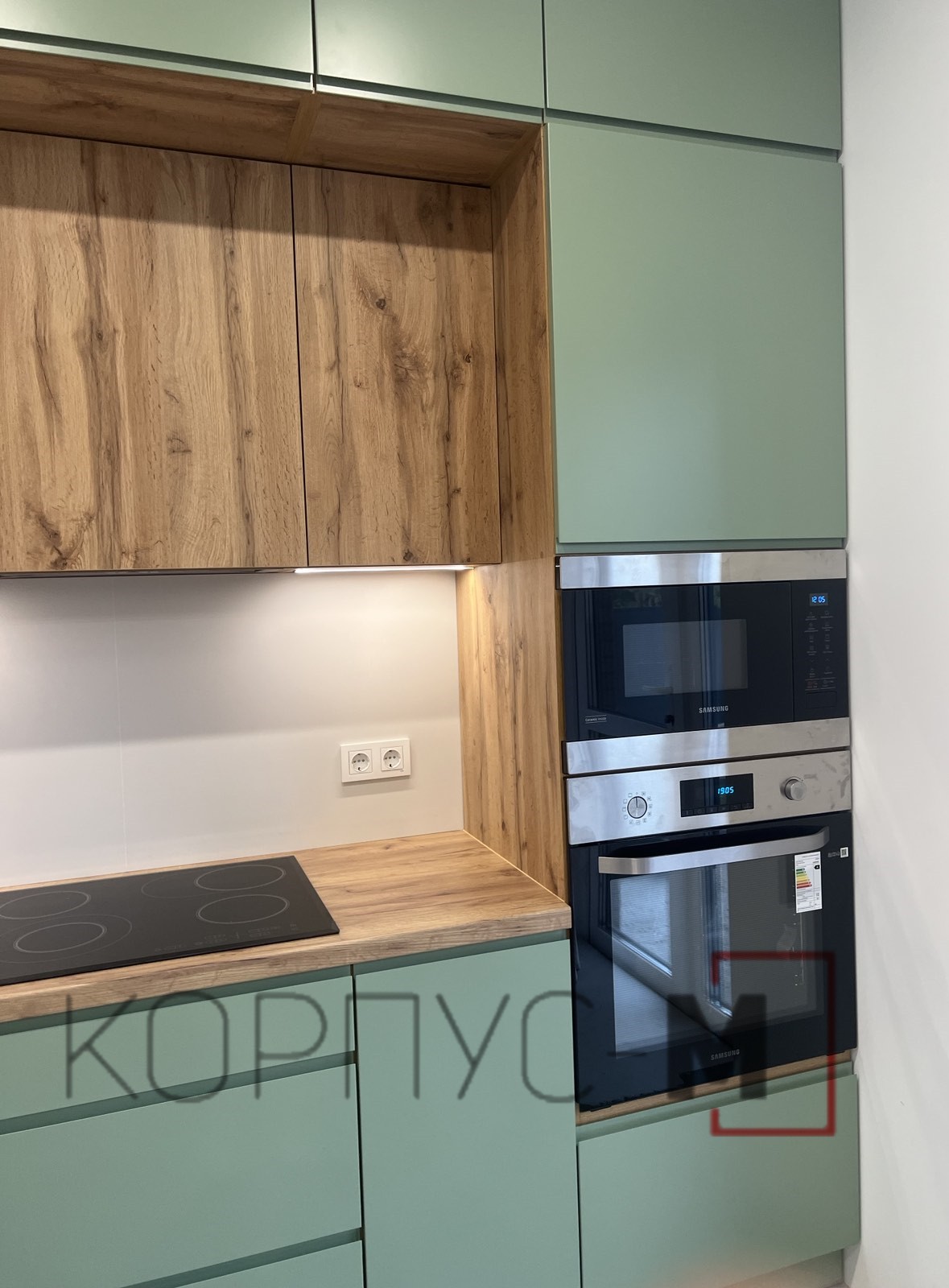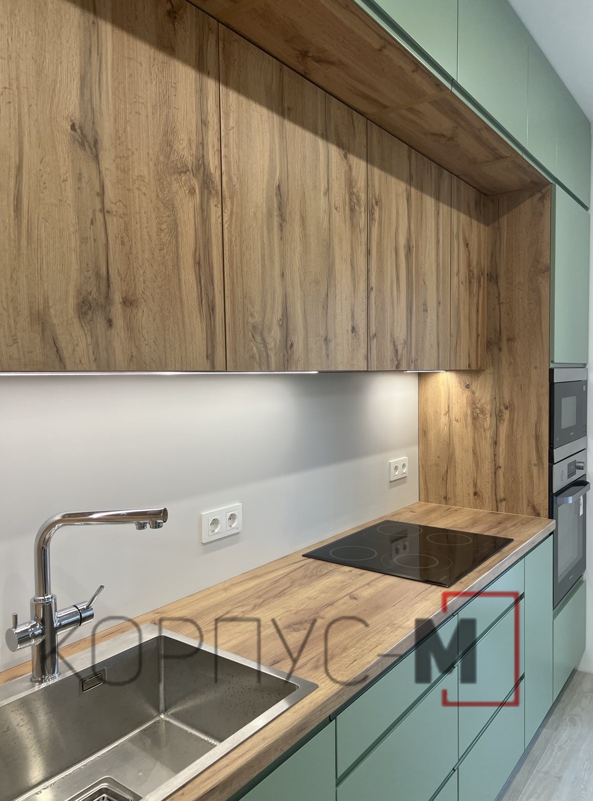 Кухня Інтерно/Interno під замовлення. Фарбовані матові фасади з інтегрованою ручкою.Стільниця гармонійно поєднується з деревоподібним корпусом та стіновою панеллю, а підсвітка додає затишку і тепла при приготуванні страв або ж просто перебуванні на кухні.