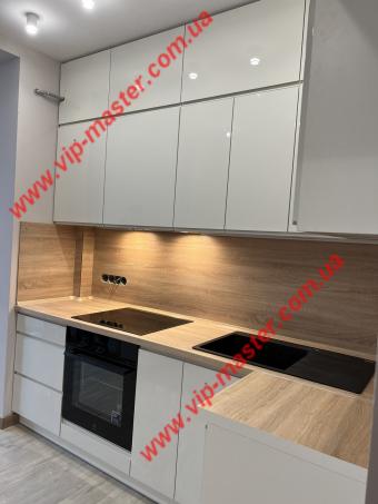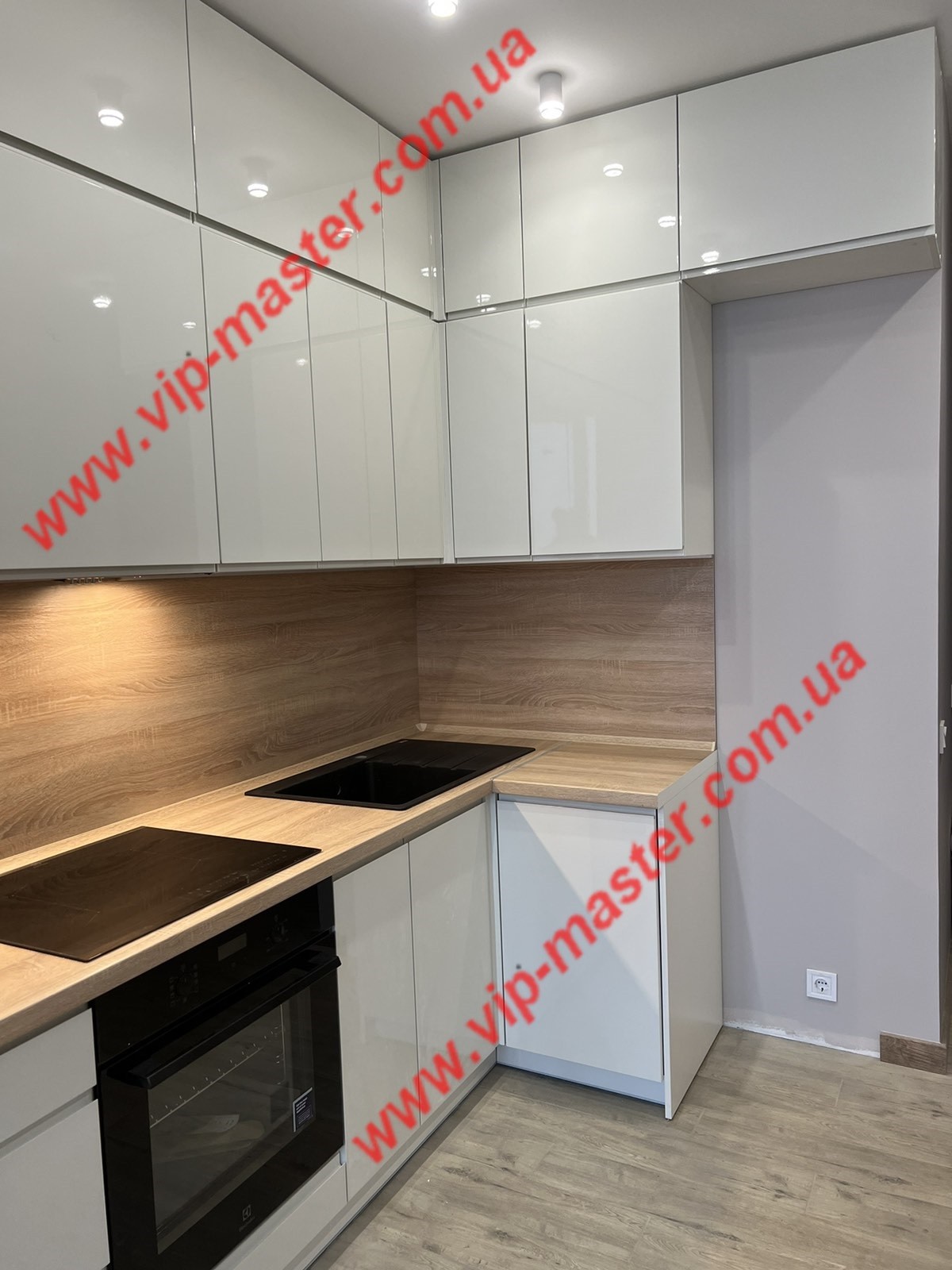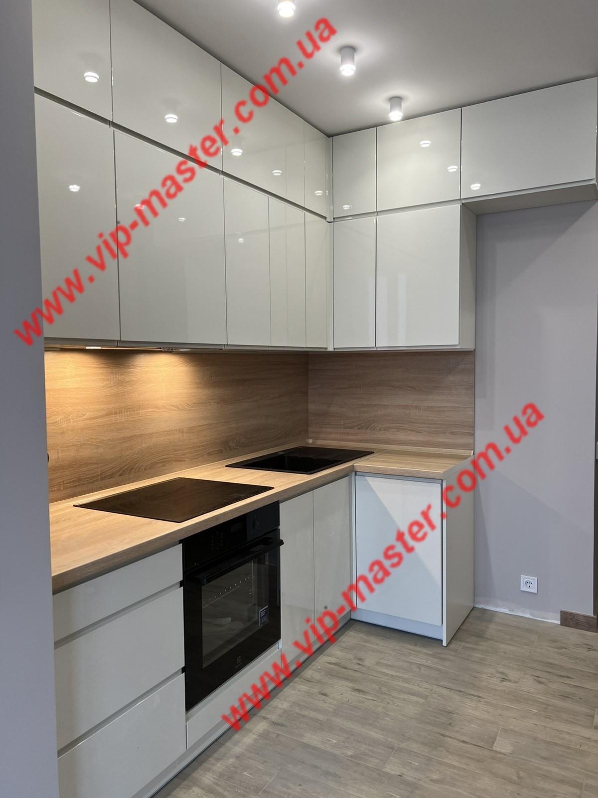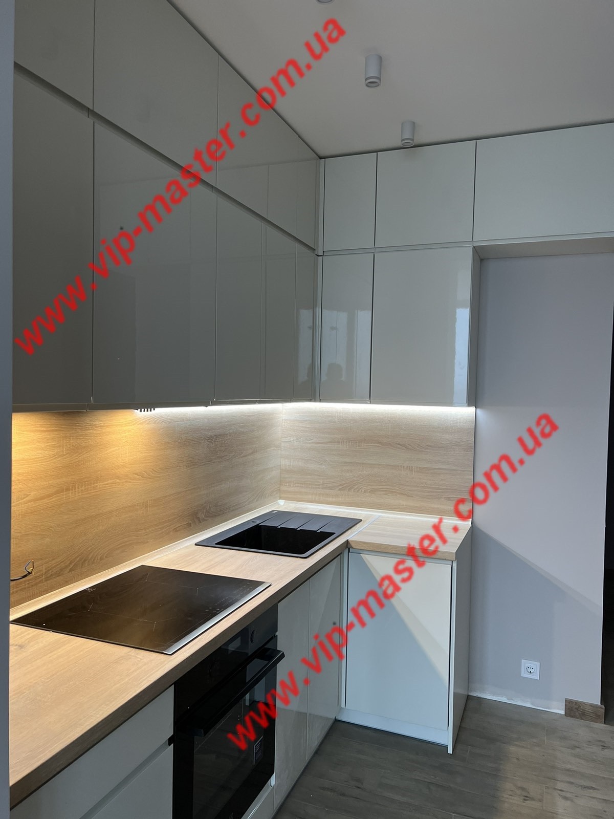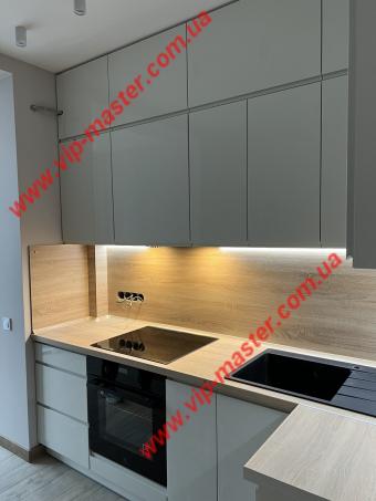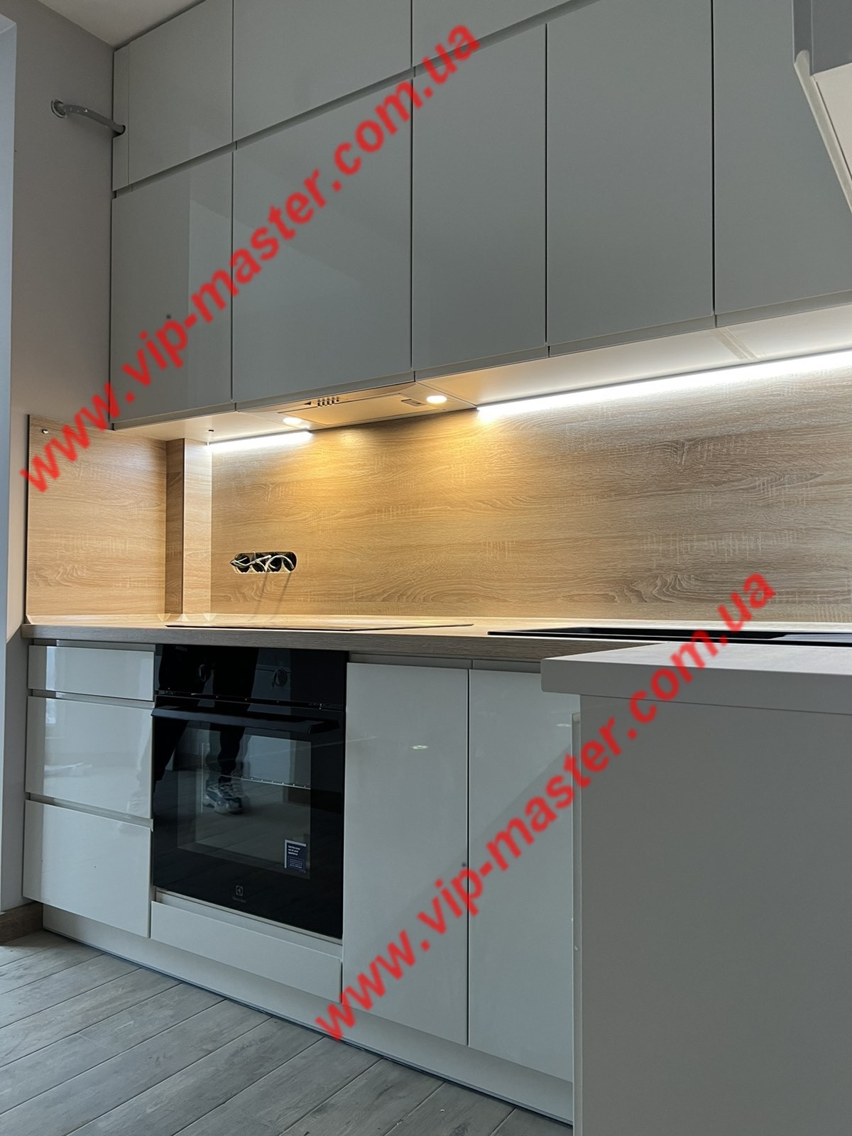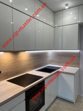 Кухня Інтерно/Intrerno,фасади світло-сірі глянцеві, стільниця Сонома 38мм. Робоча стінка в колір стільниці та підсвітка створює затишок, зручність та гармонію при використанні такого кухонного гарнітуру.