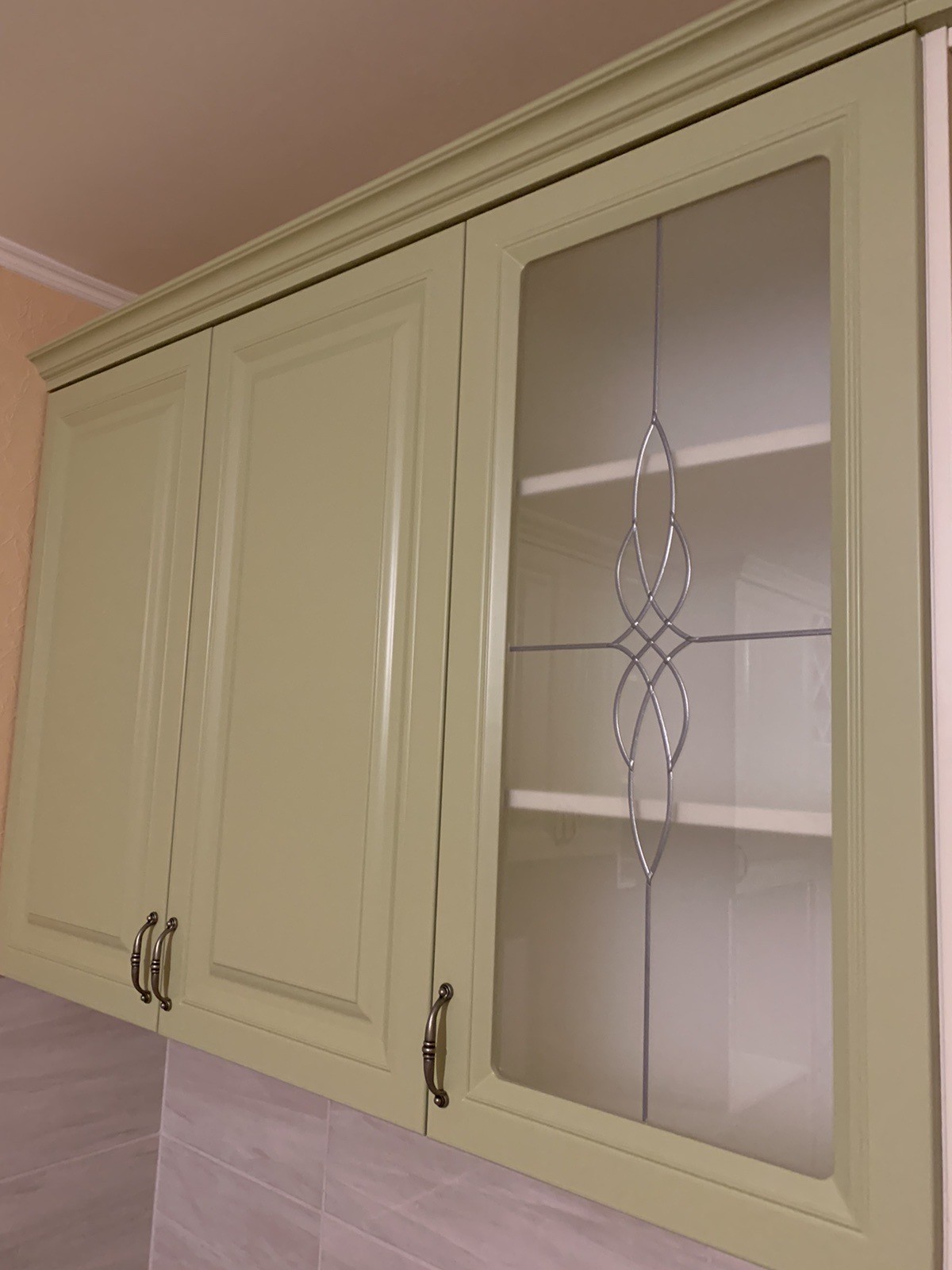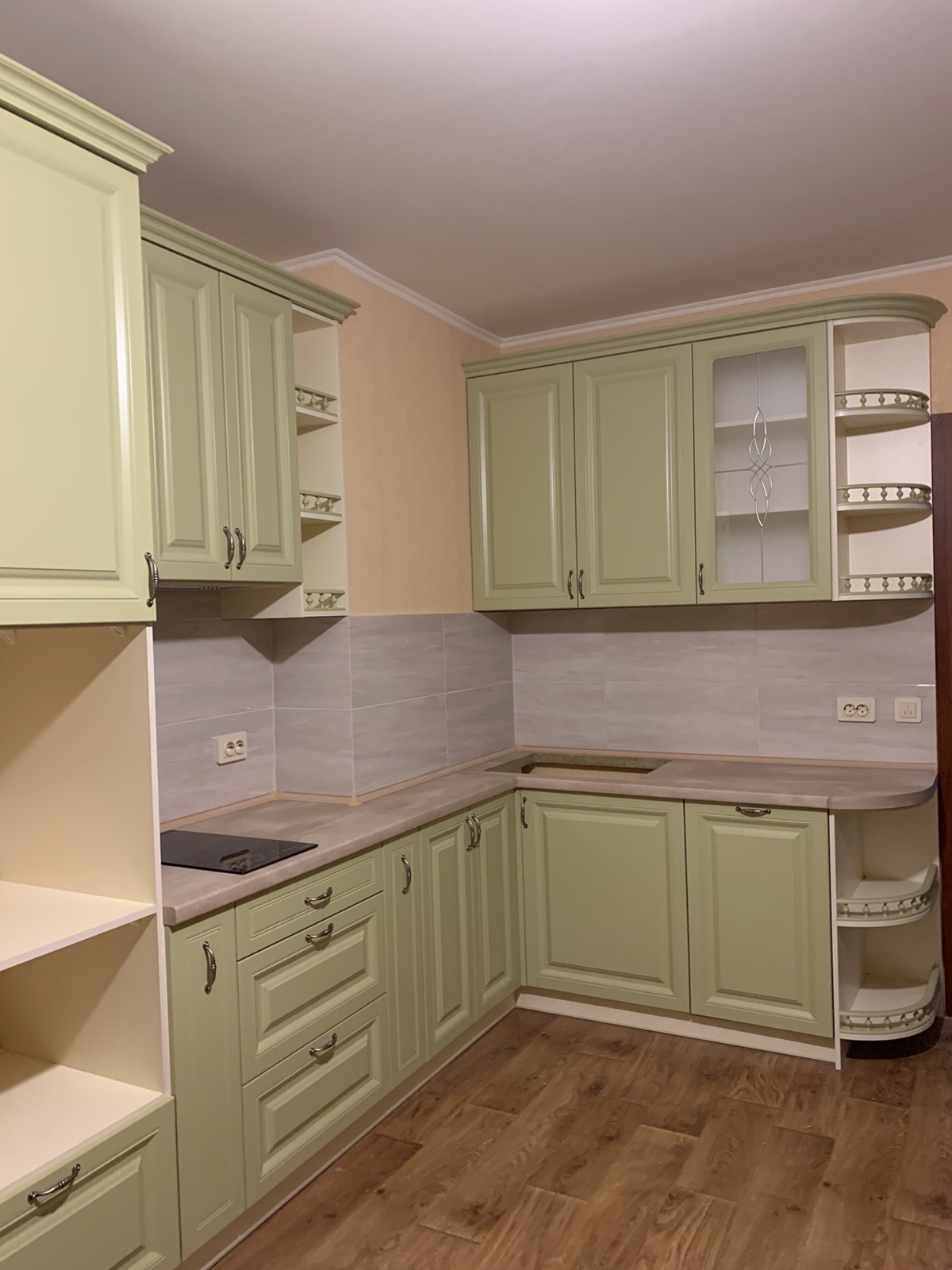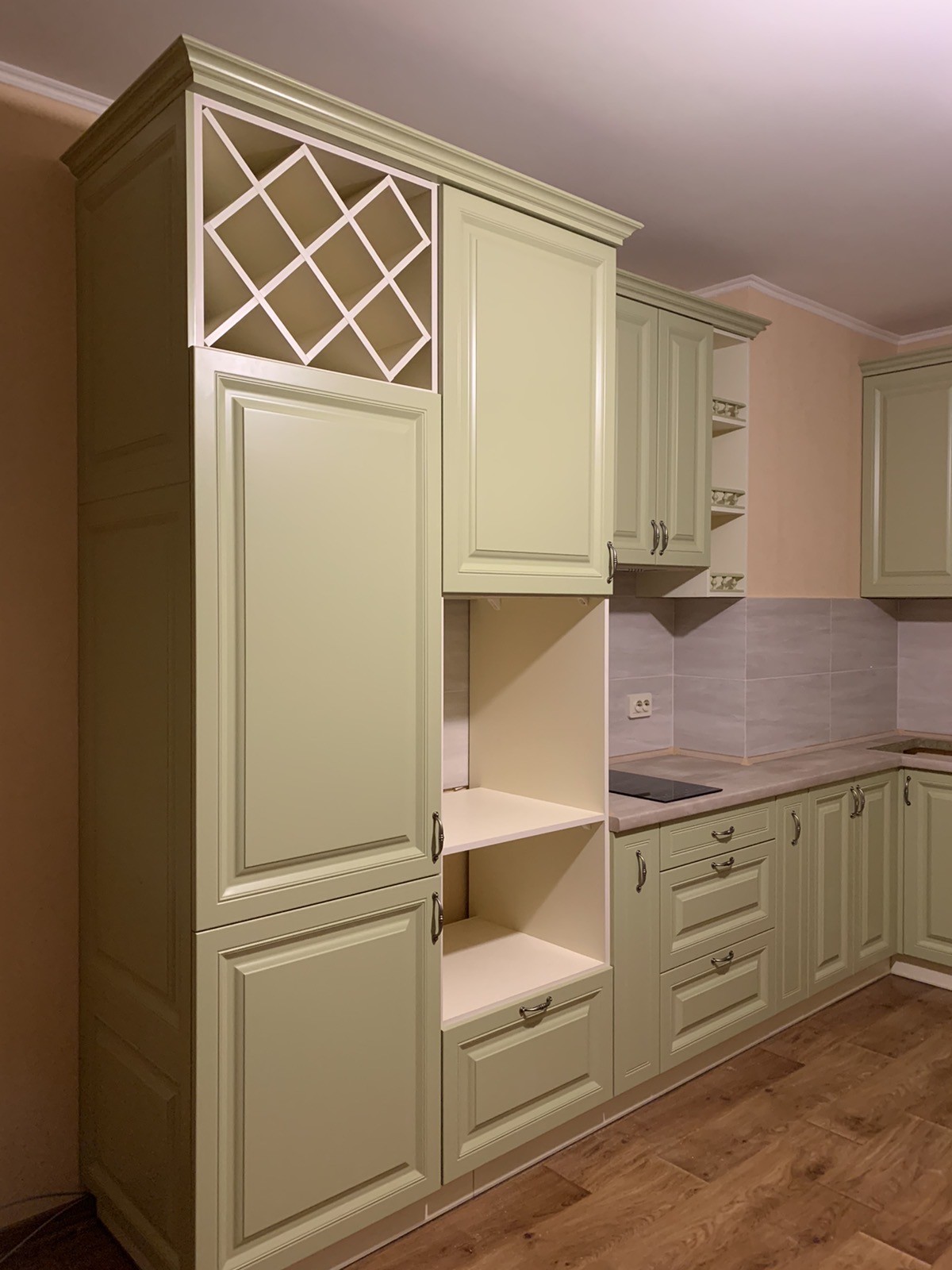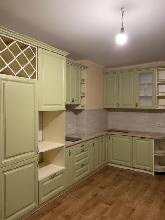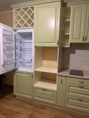 Кухня «Мелані» фарбована. Виконана в фісташковому кольорі з балюстрадами, холодильник вбудований.
