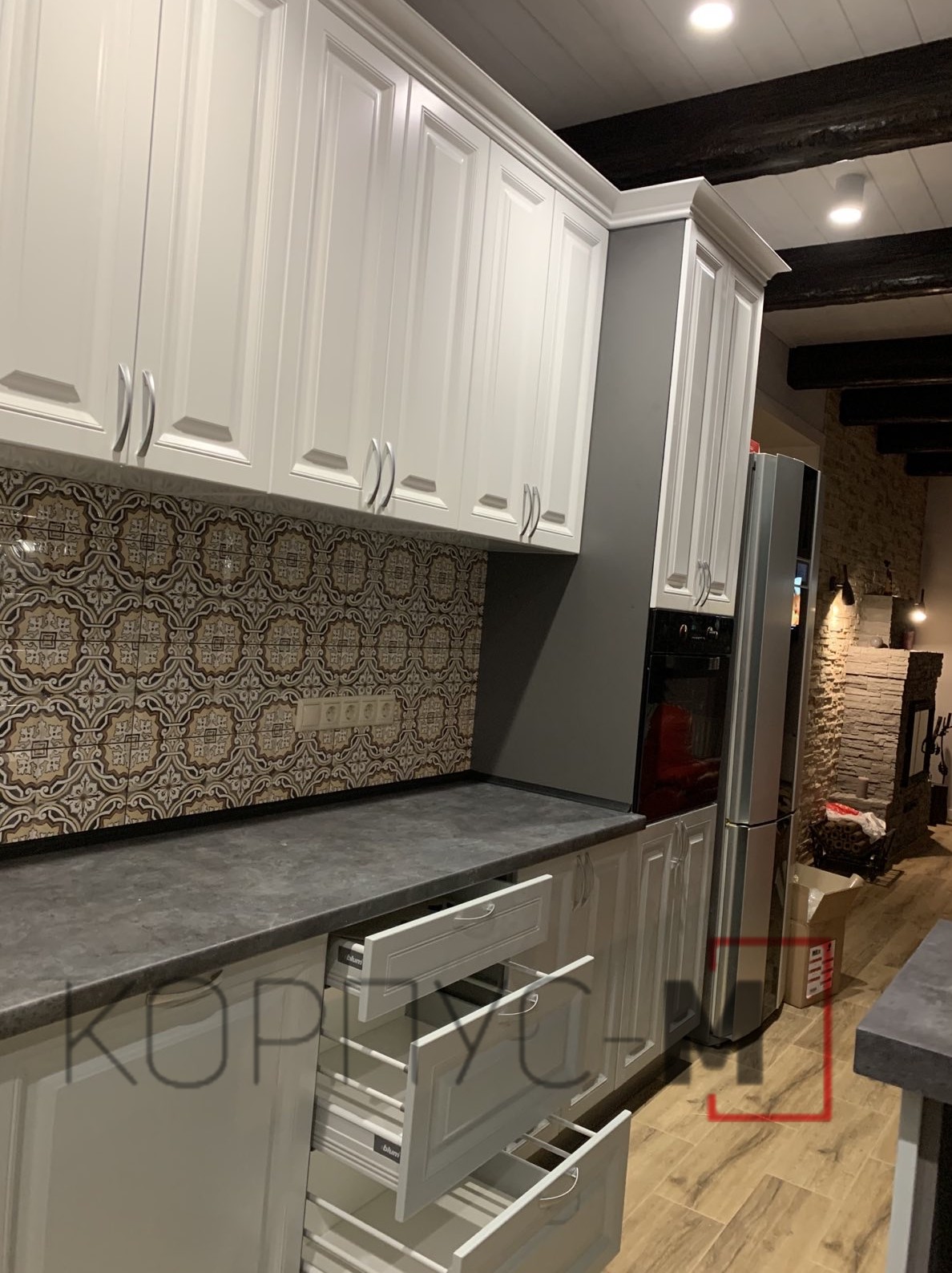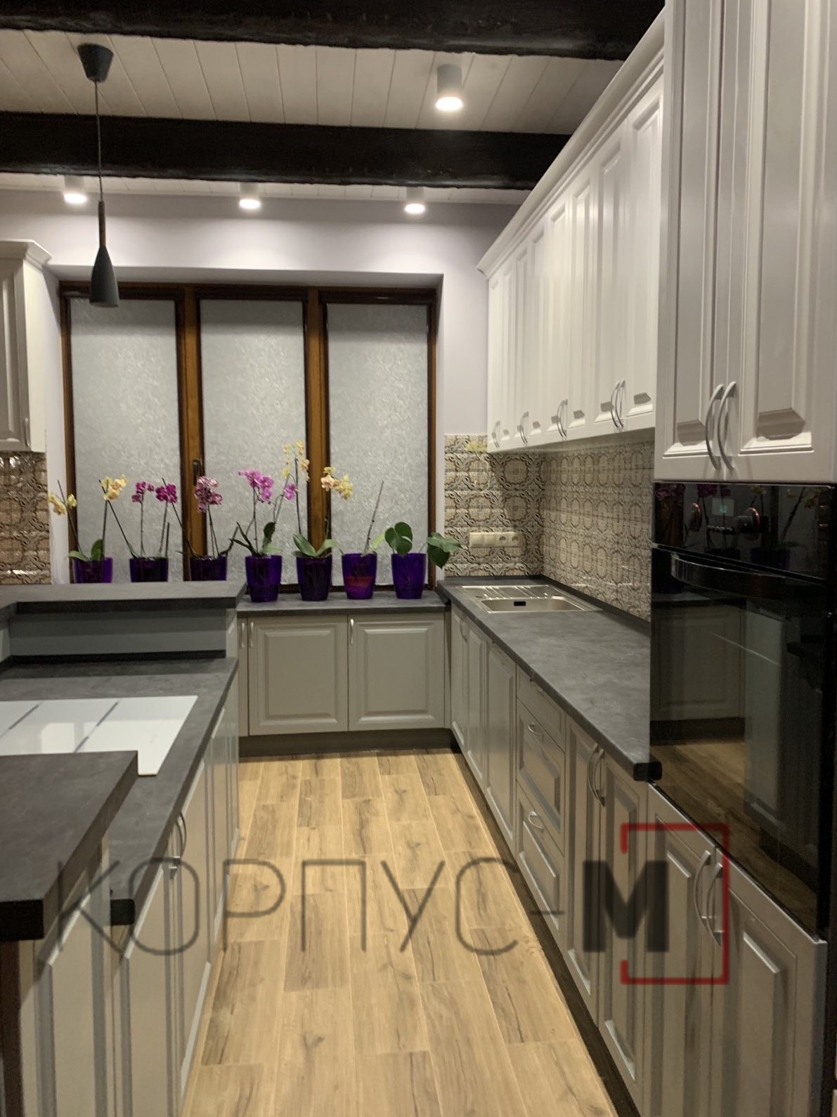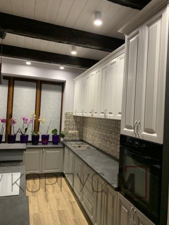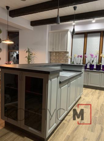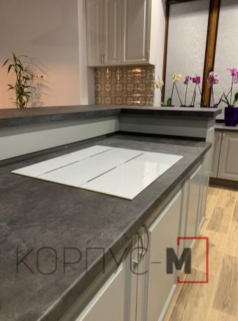 Кухня «Мелані», фарбовані фасади. Стільницю «Селена» виробництва Люксформ, використано, як для острова, так і для підвіконня. Завдяки цьому виріб гармонійно поєднується в одну композицію, підкреслює завершеність стилю та збагачує кухню.
