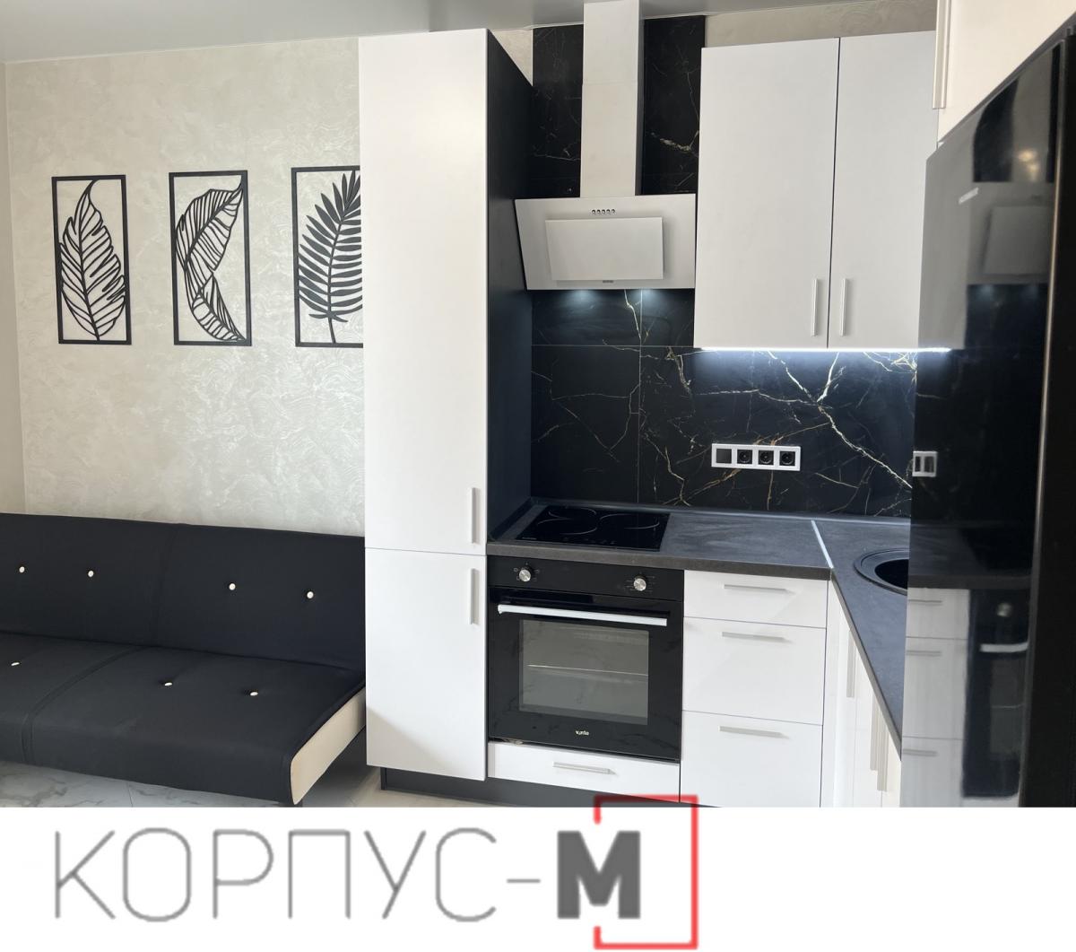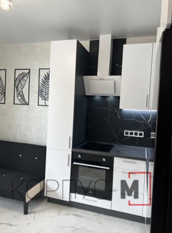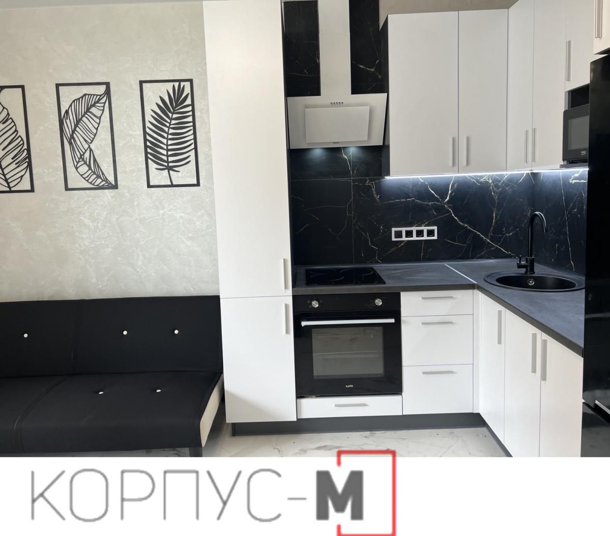 Кухня Мода доповнена нестандартним пеналом. Корпус виконано з ДСП в кольорі антрацит, фасади перлина, стільниця кераміка чорна 38 мм.