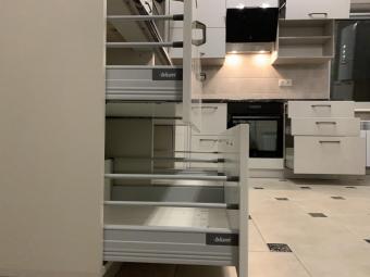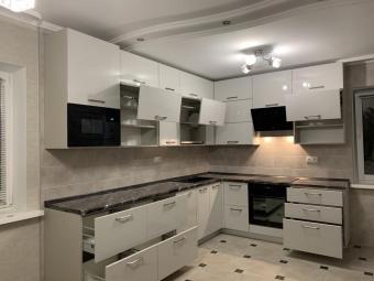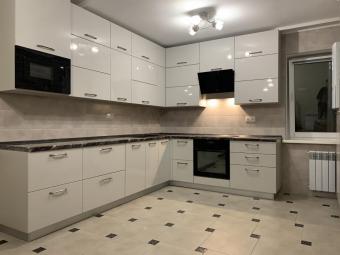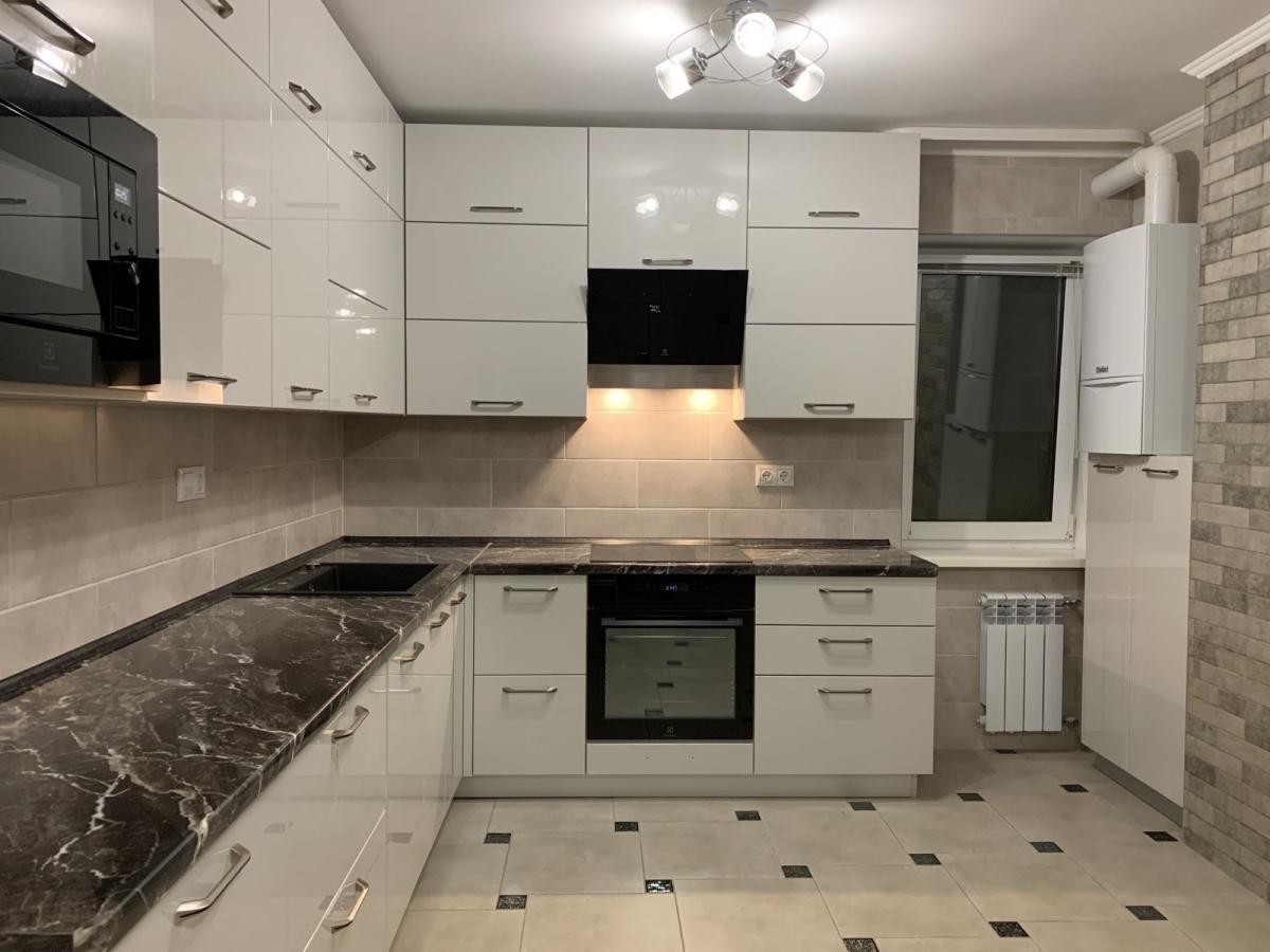 Виконана на замовлення з фарбованих, глянцевих фасадів. Білий колір в глянцевому виконанні підкреслює чіткість ліній та візуально збільшує розмір приміщення. Стільниця - Арабіскато Люксформ, водостійка. Фурнітура - Blum (Австрія) з довідниками.