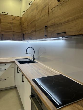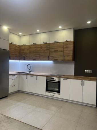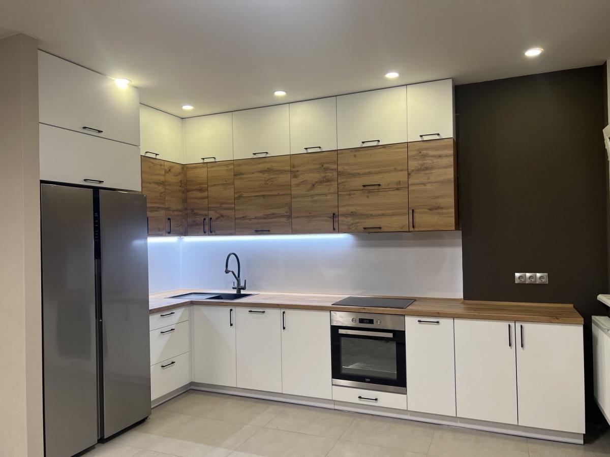Кухня під замовлення,що поєднує в собі концепцію використання різних матеріалів фасадної частини: фарбовані МДФ-фасади та фасади з ламінованої ДСП у деревоподібній текстурі. Стільниця в тому ж декорі підкреслює природність і додає відчуття затишку.