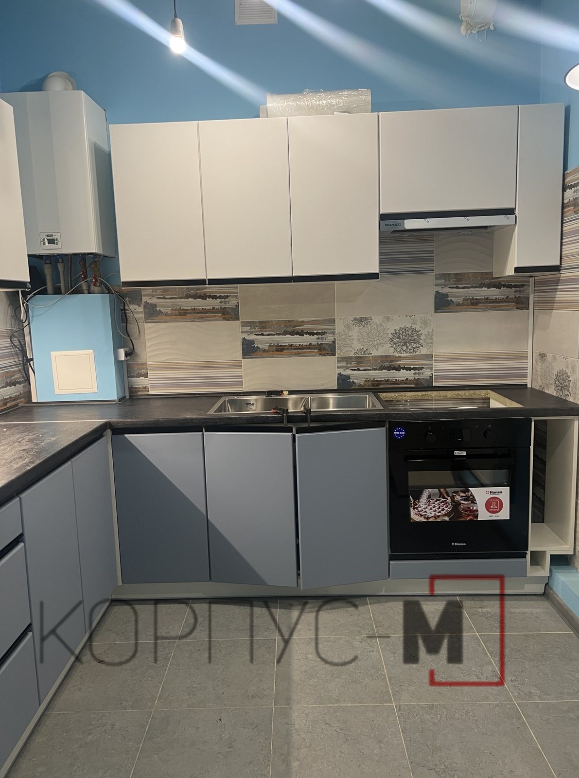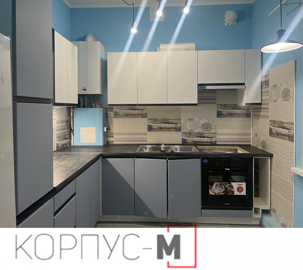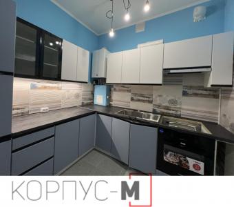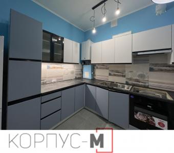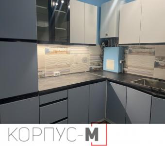 Кухня Ріо Лайн/RioLine, виробництва Віп Мастер/Vip-Master, фасад Сіро-блакитний BL та Білий BL матовий декор, стільниця Кераміка чорна.