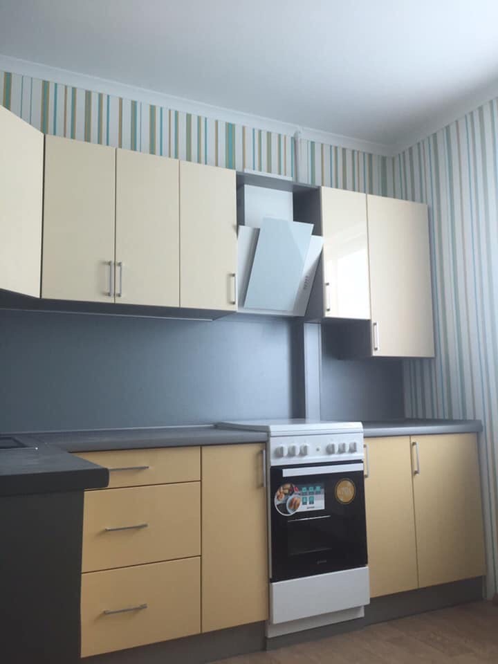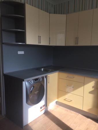 Невелика, компактна кухня, виконана зі шпонованих та фарбованих фасадів.