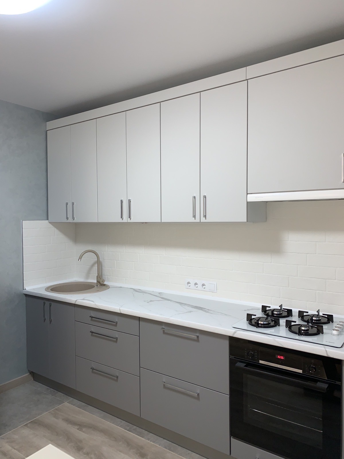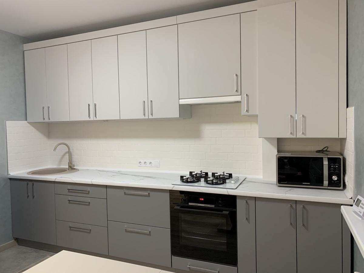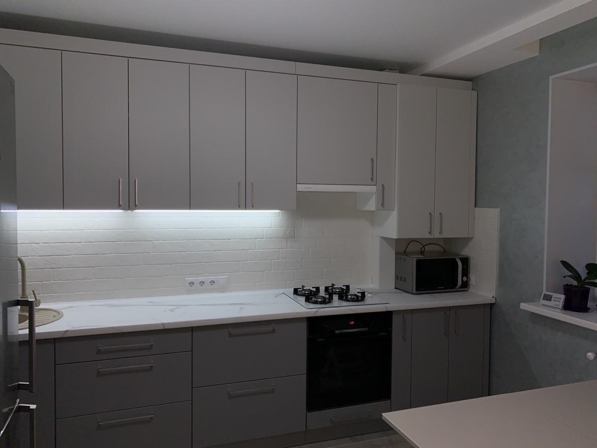 Кухня з фарбованими фасадами та підсвіткою. Матові сірі та білі тони покраски є актуальними, стильними та модними начасі, а локанічні ручки лише підкреслюють завершеність виробу! ️Нічого зайвого... Завжди з думкою про Вас ©️ КорпусМ