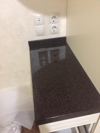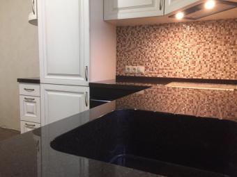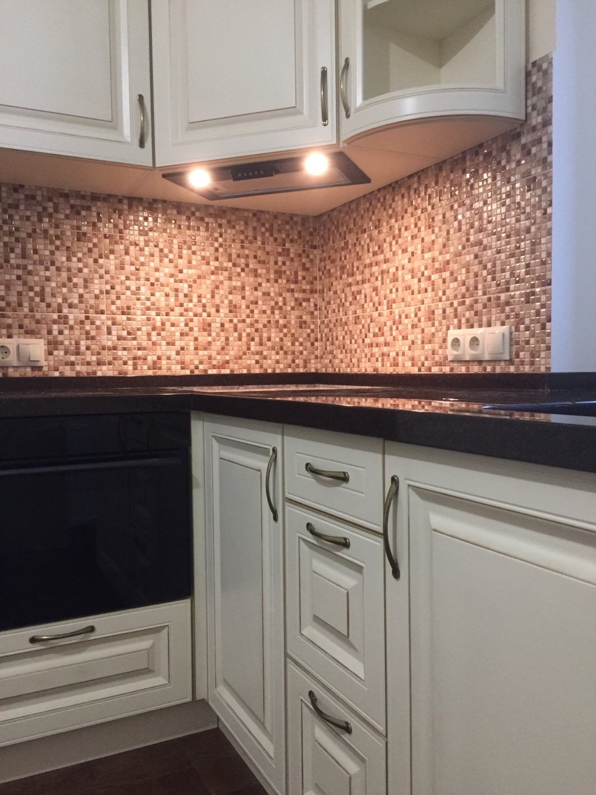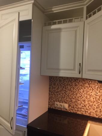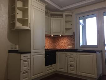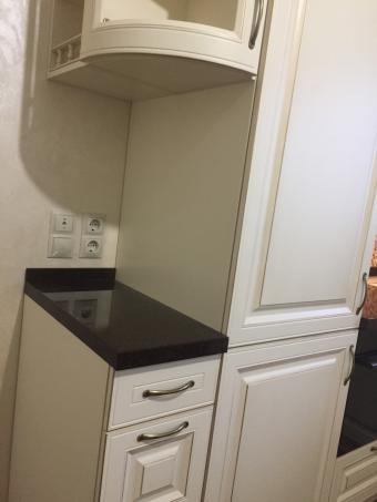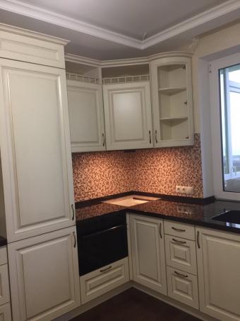 Кухонний гарнітур у класичному стилі.Фасади Мелані, фарбовані в кольорі слонова кістка, патина золото.Кухня розмістилась на невеличкій площі, стільниця зі штучного каменю лаконічно об‘єднує кухню з вікном,заміщуючи підвіконня та розширюючи простір.
