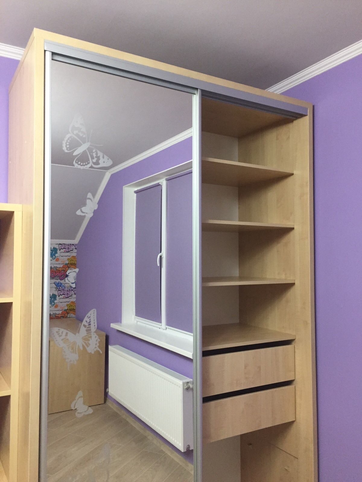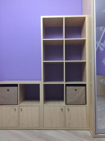 Шафа-купе у поєднанні з модульною системою Доміно. Є короба для збереження дрібної канцелярії та письмовий стіл.